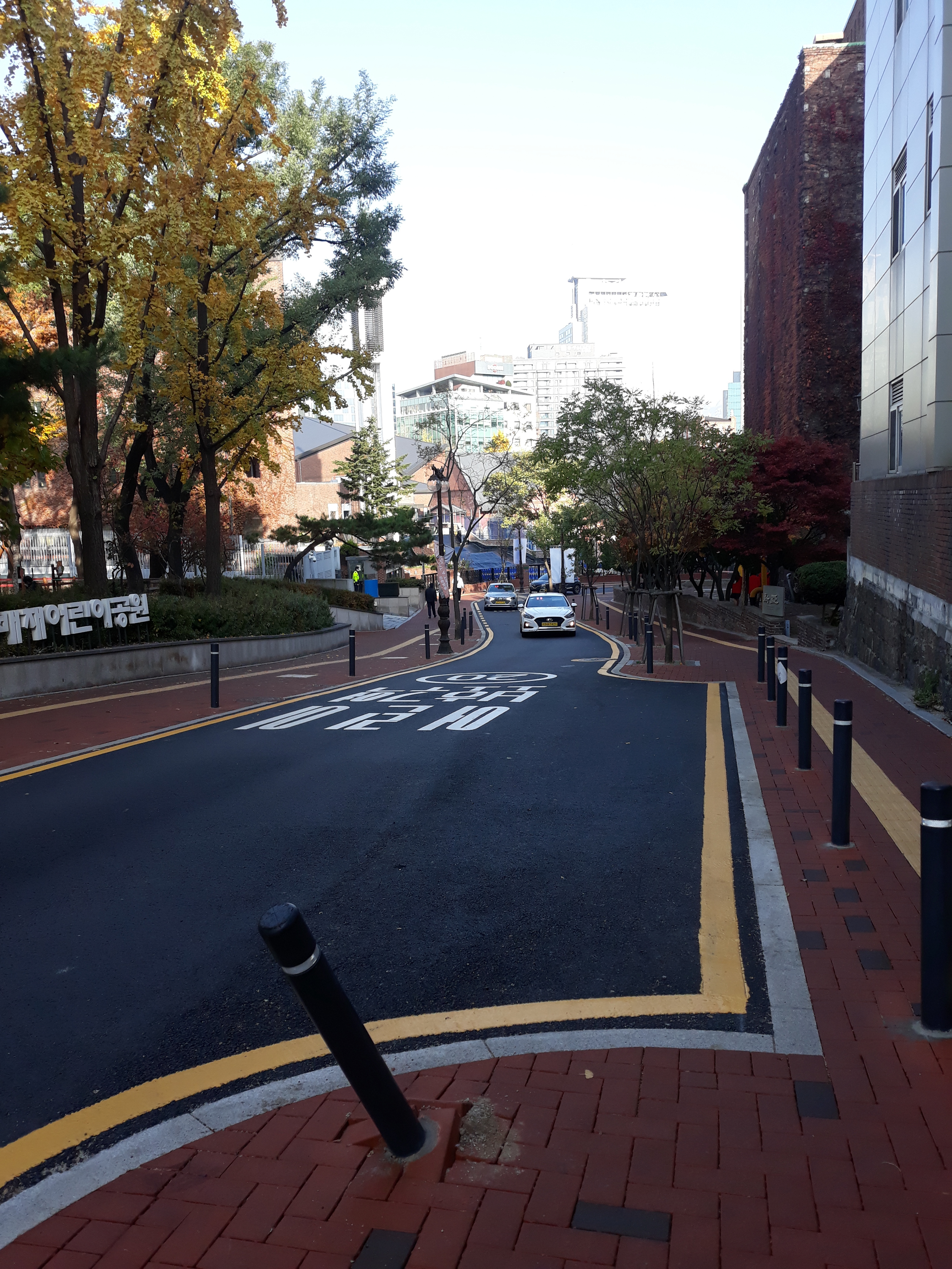 주한러시아대사관 정문 앞 도로가 일방통행이어서 차량은 경사진 도로 한 방향으로만 운행한다.