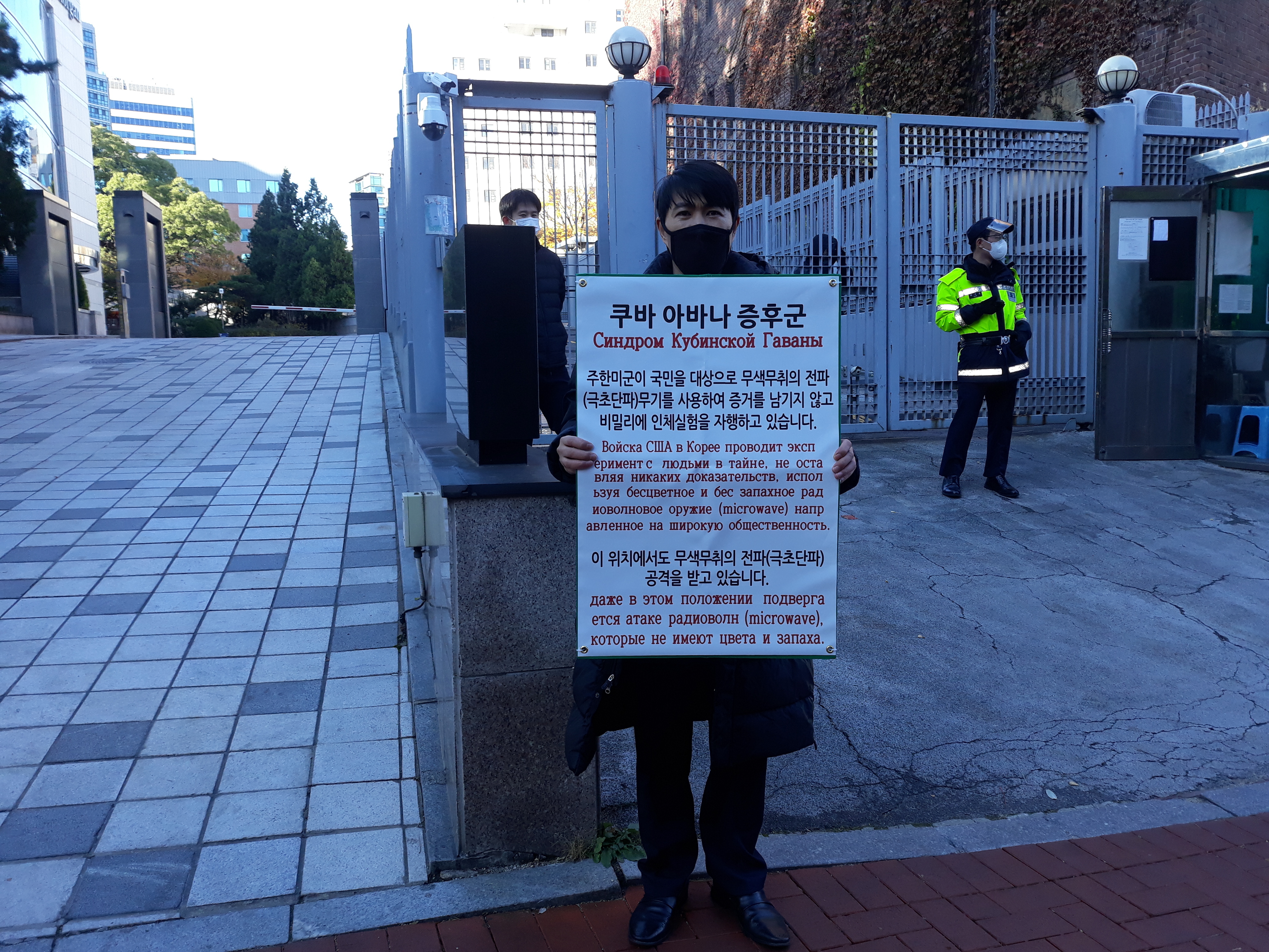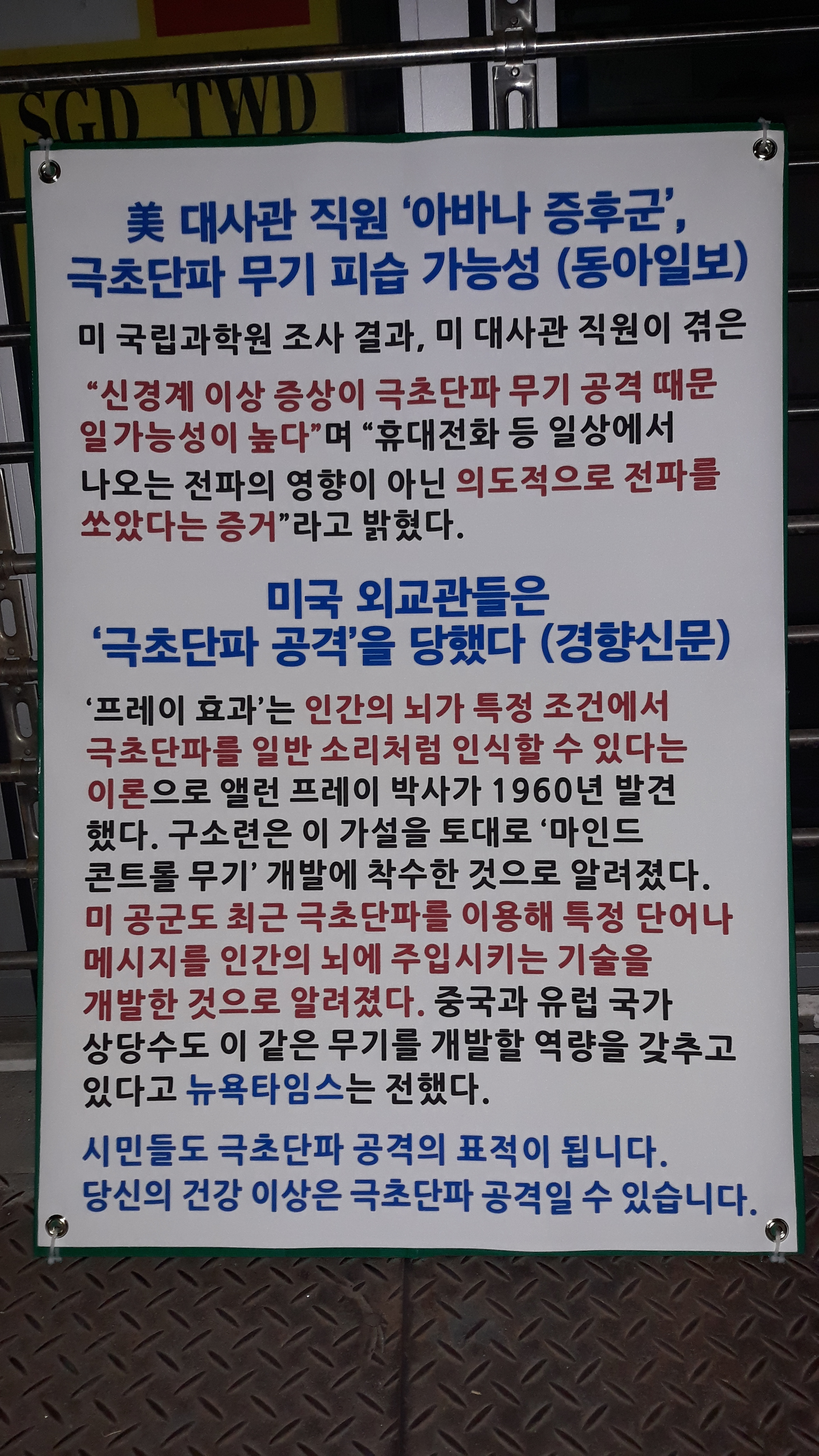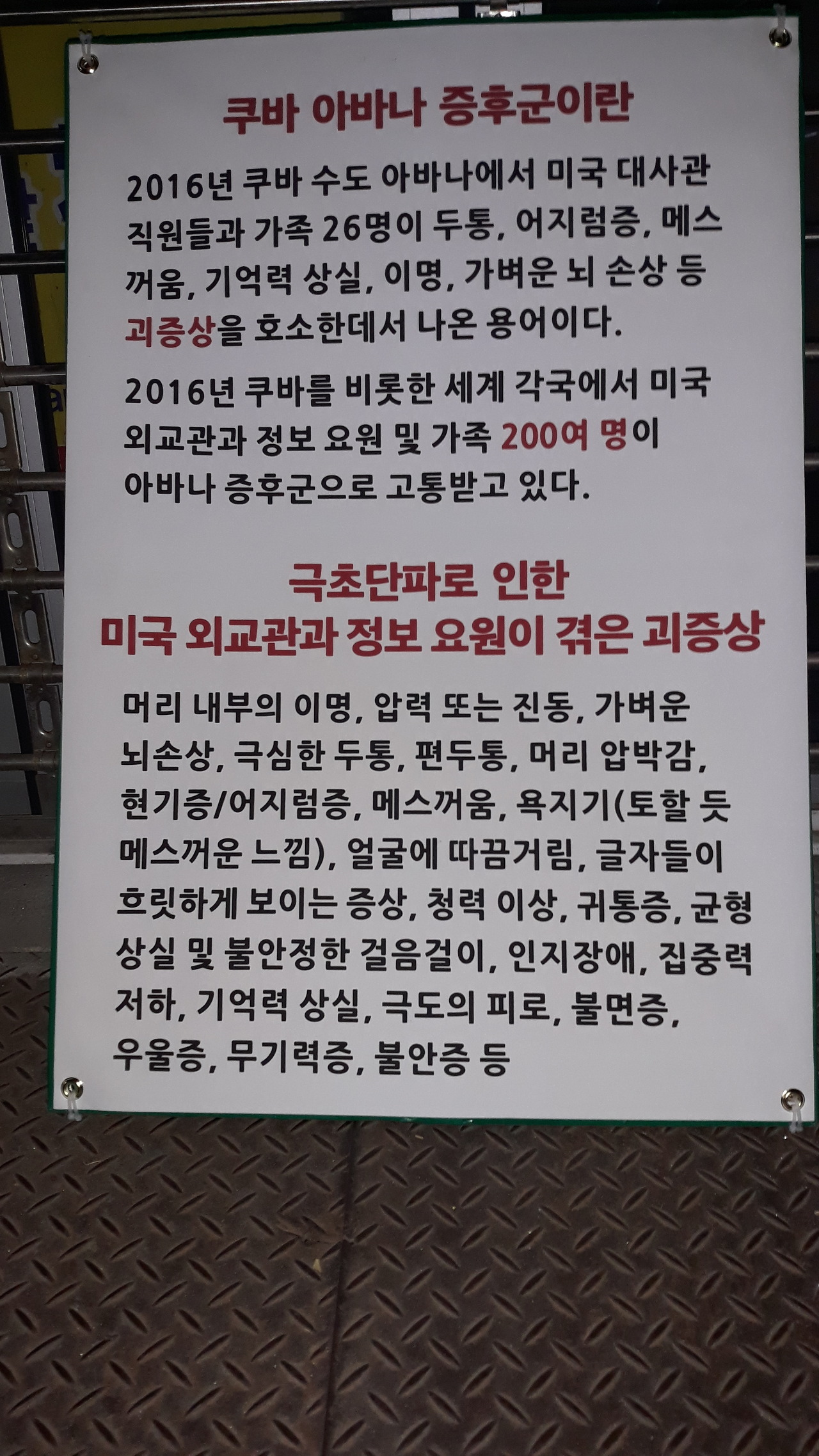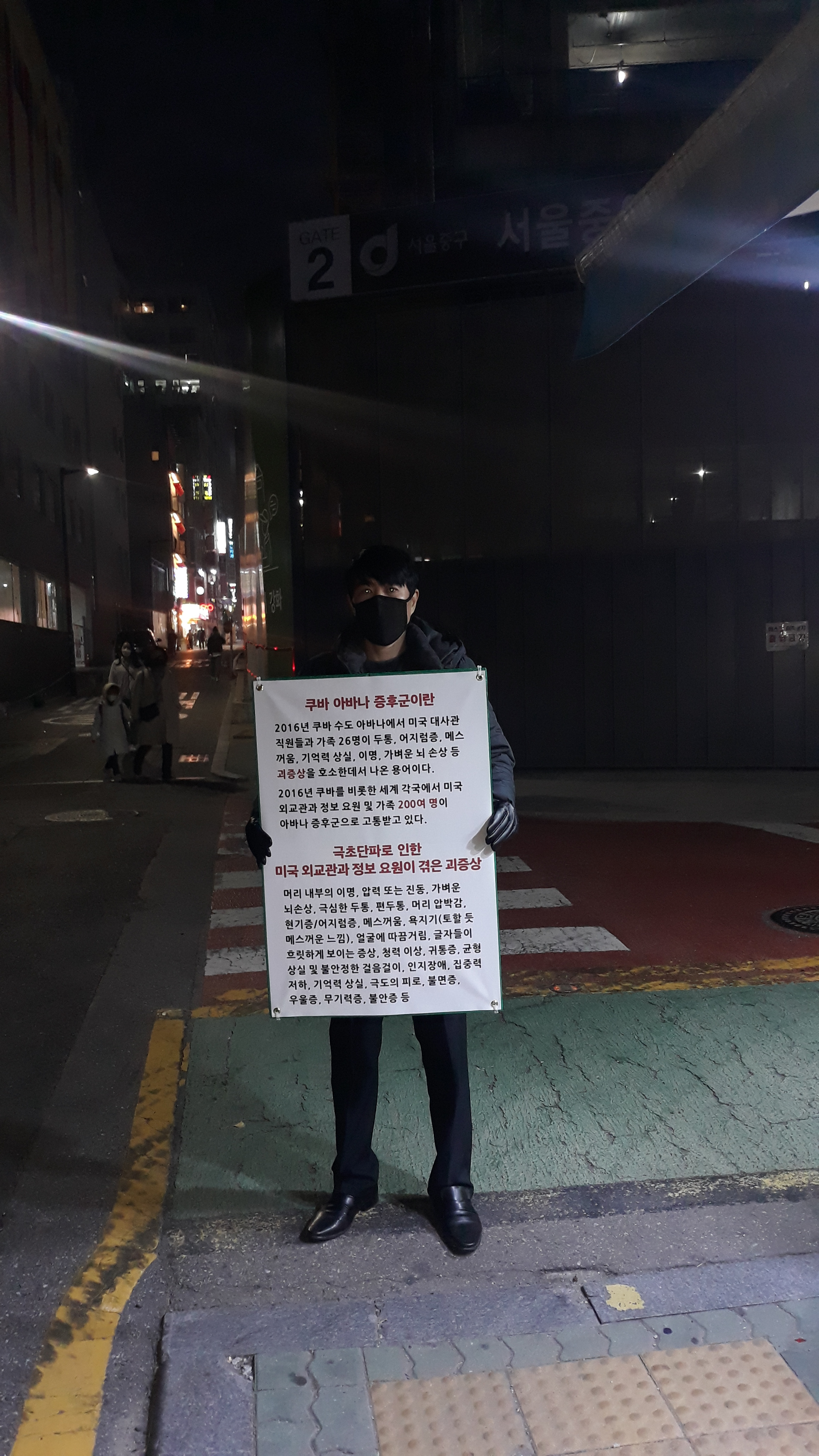 ⟶ 쿠바 아바나 증후군으로 대사관 정문에서 경비 근무를 서고 있는 경찰관과 의경을 설득시킬 수 없다면, 다른 누구도 설득시킬 수 없다. 그들은 피켓 문구에 적힌 신문 기사 내용을 수십 번 보기 때문이다.