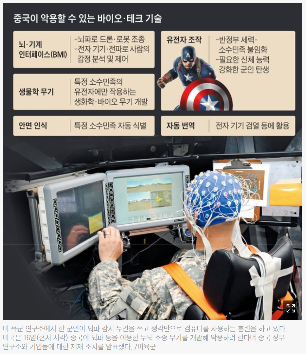 미 상무부는 16일(현지 시각) 중국 군사과학원 산하 연구원 11곳에 대한 제재를 발표하면서 “이들이 두뇌 조종(brain-control weaponry)을 포함한 무기를 개발하고 있다”고 밝혔다. 중국군과 민간이 결합해 유전자 조작, 인간 능력 향상, 뇌·기계 인터페이스(Brain Machine Interface) 같은 최첨단 생물공학 기술을 군사적인 목적에 활용하려고 한다는 것이다.