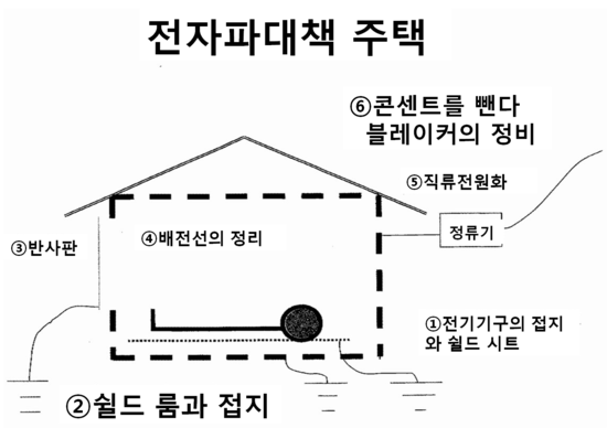 전자파에는 전기장과 자기장이 있습니다. 전파는 지붕에 강판을 치거나, 외벽에 얇은 철판을 두르거나, 금속 블라인드를 붙이는 등으로 차단되지만, 반드시 모두 접지를 취하지 않으면 안됩니다.