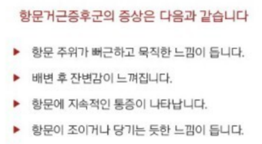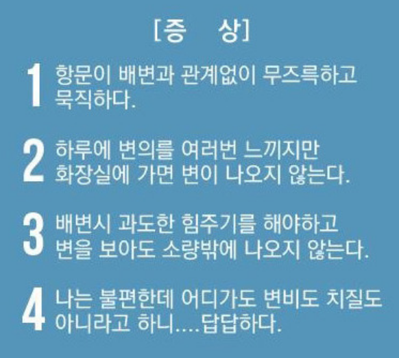 항문 주위가 뻐근하고 쑤시는 듯한 통증 Stiff and shooting pain around the anus