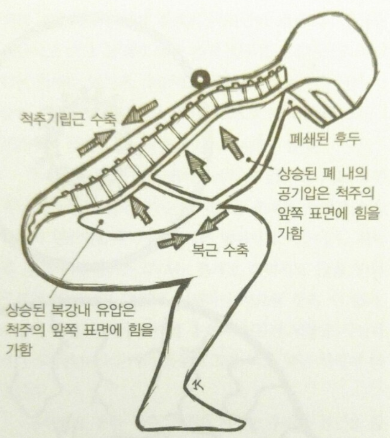 복근 수축에 의해 상승된 폐 압력(흉강 내압)과 복강 내압 및 척추기립근(세움근) 수축의 결합 효과는 부하가 가해지는 동안 척추 안정성에 영향을 미친다. 발살바 방법은 이러한 압력과 안정성을 만들어내는 능력을 상승시킨다.