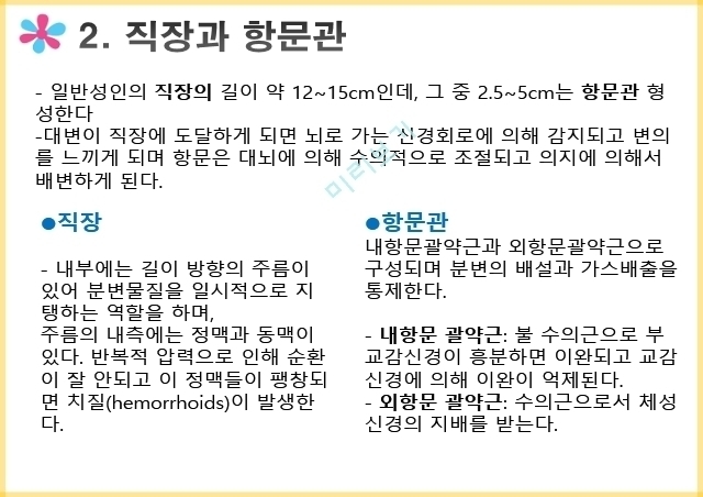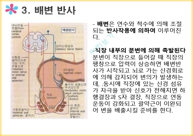 2. 곧창자(직장) 근육의 불수의적인 수축과 내항문 괄약근을 이완하여 변의를 유발한다.