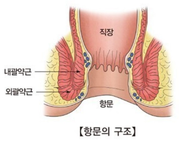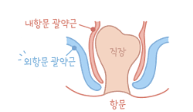 ⦁ 내항문 괄약근(조임근) ⟶ 불수의근(내 의지와 관계없이 스스로 움직이는 근육)