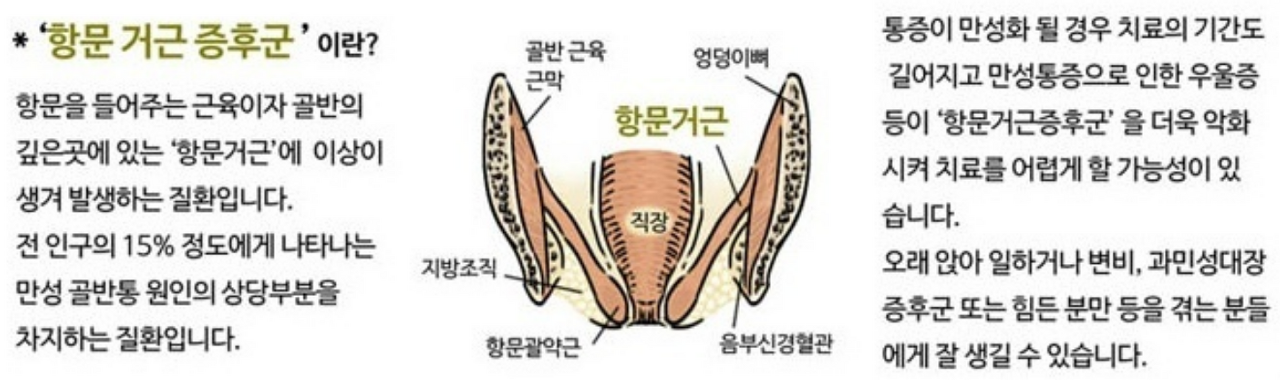 항문괄약근 중 가장 깊은 곳에 위치해 배변을 조절해주는 역할을 한다. 항문거근증후군은 항문거근의 과도한 긴장이나 반복적인 미세 손상으로 인해 ‘평소에 항문 안쪽에 뭔가 끼인 느낌’ 또는 ‘항문이 빠질 듯한 느낌 또는 작열감’, ‘대변을 보고 난 후에도 묵직하고 배변 후 5∼10분 정도 지나 증가하는 통증’ 등을 느끼는 질환이다.