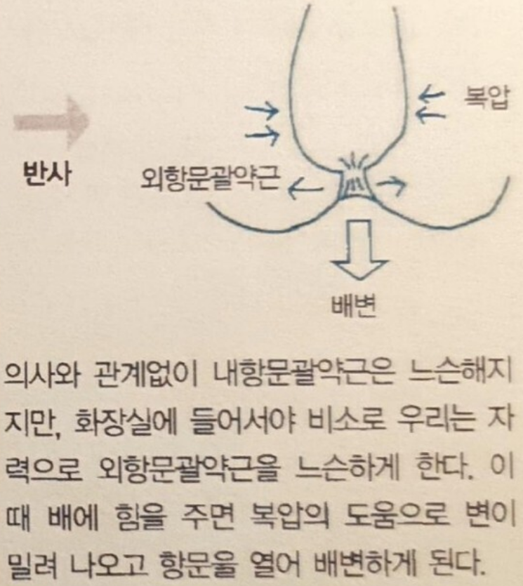 항문은 의사와 무관하게 움직이는 내항문괄약근과 의사로 움직이는 외항문괄약근이라는 근육에 의해 이중으로 보호되어, 함부로 변이 새지 않도록 되어 있다. 더구나 외항문괄약근에는 항상 대뇌에서 폐쇄 명령이 내려져 자고 있을 때도 배변하지 않도록 되어 있다. 직장에 변이 쌓여 내압이 일정 수준 이상이 되면 대뇌에 자극이 전달되고, 배변반사로 변의가 생긴다. 이 반사로 내항문괄약근을 열리지만, 화장실에 가기 전까지는 와항문괄약근의 힘으로 참게 된다.