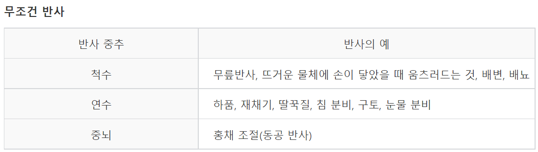 무조건 반사 ⟶ 자극이 주어졌을 때 의식과는 상관없이 반응이 일어나는 것이다. 태어나면서부터 선천적으로 가지고 있는 반사로, 자극에 대해 즉각적으로 일어난다.
