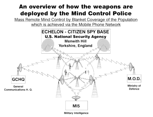 디지털 컴퓨터를 사용하여 인간 두뇌의 EEG를 읽고 개인을 식별/추적할 수 있는 특수 EMF 장비의 고정 네트워크. NSA SIgnals Intelligence의 EMF 신호를 통한 ESB (Electric.al Stimulation to Brain)는 피험자를 제어하는 데 사용됩니다.