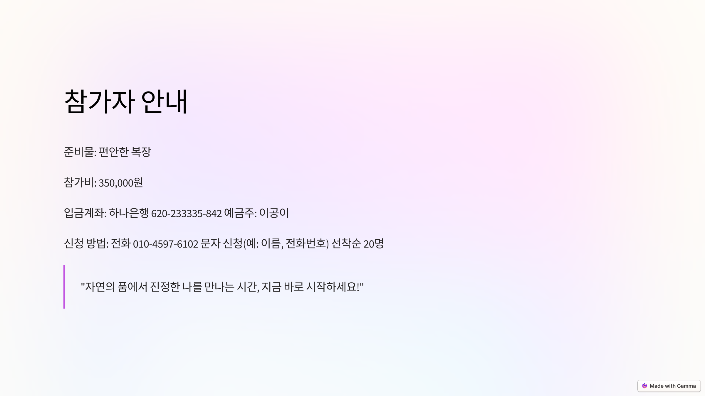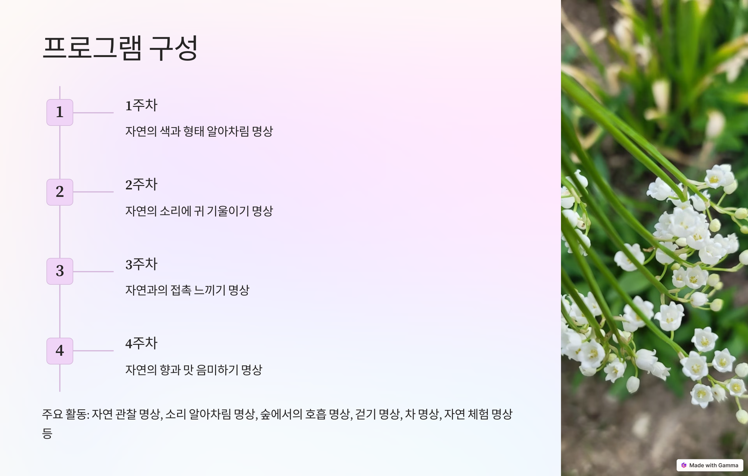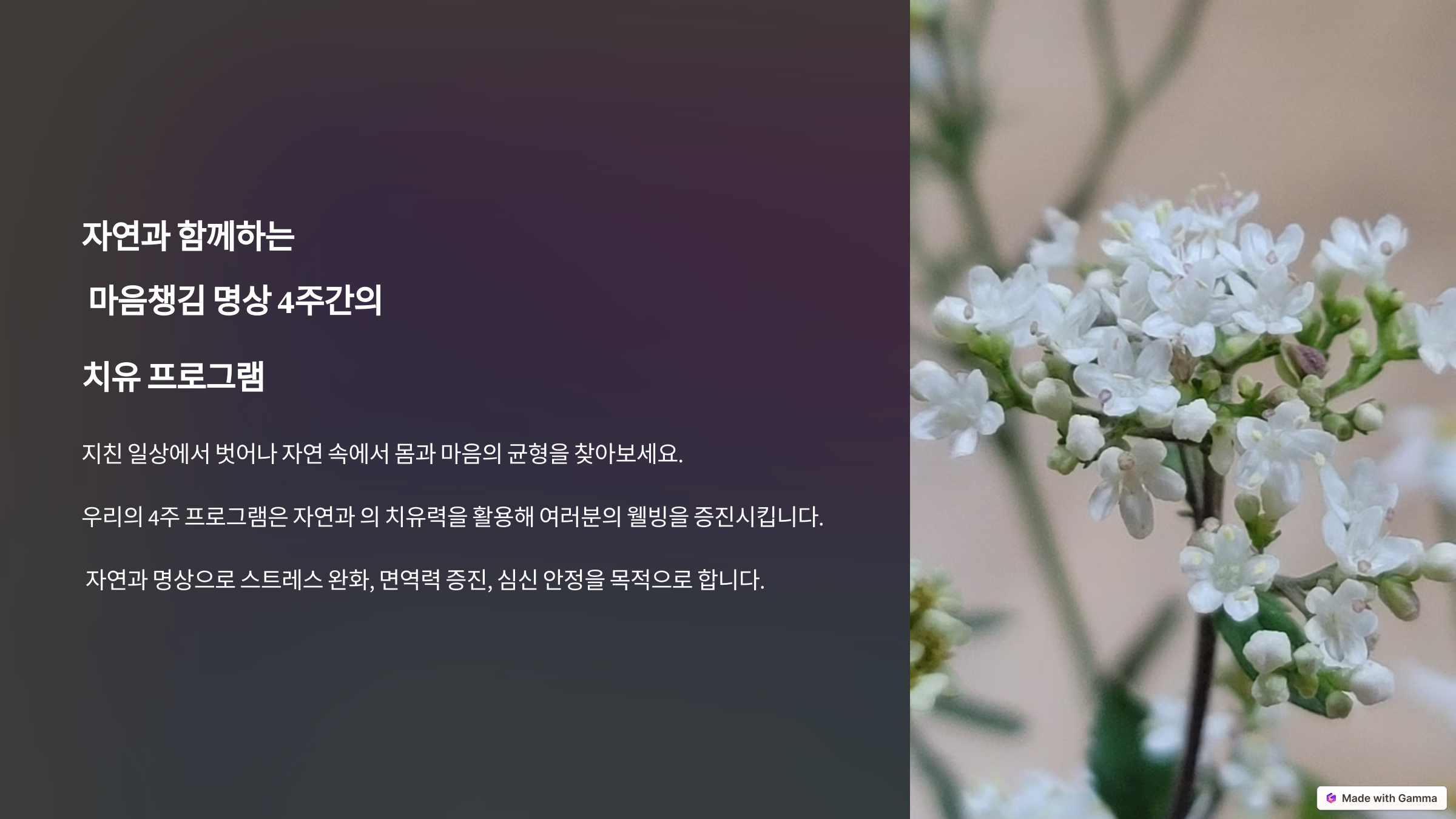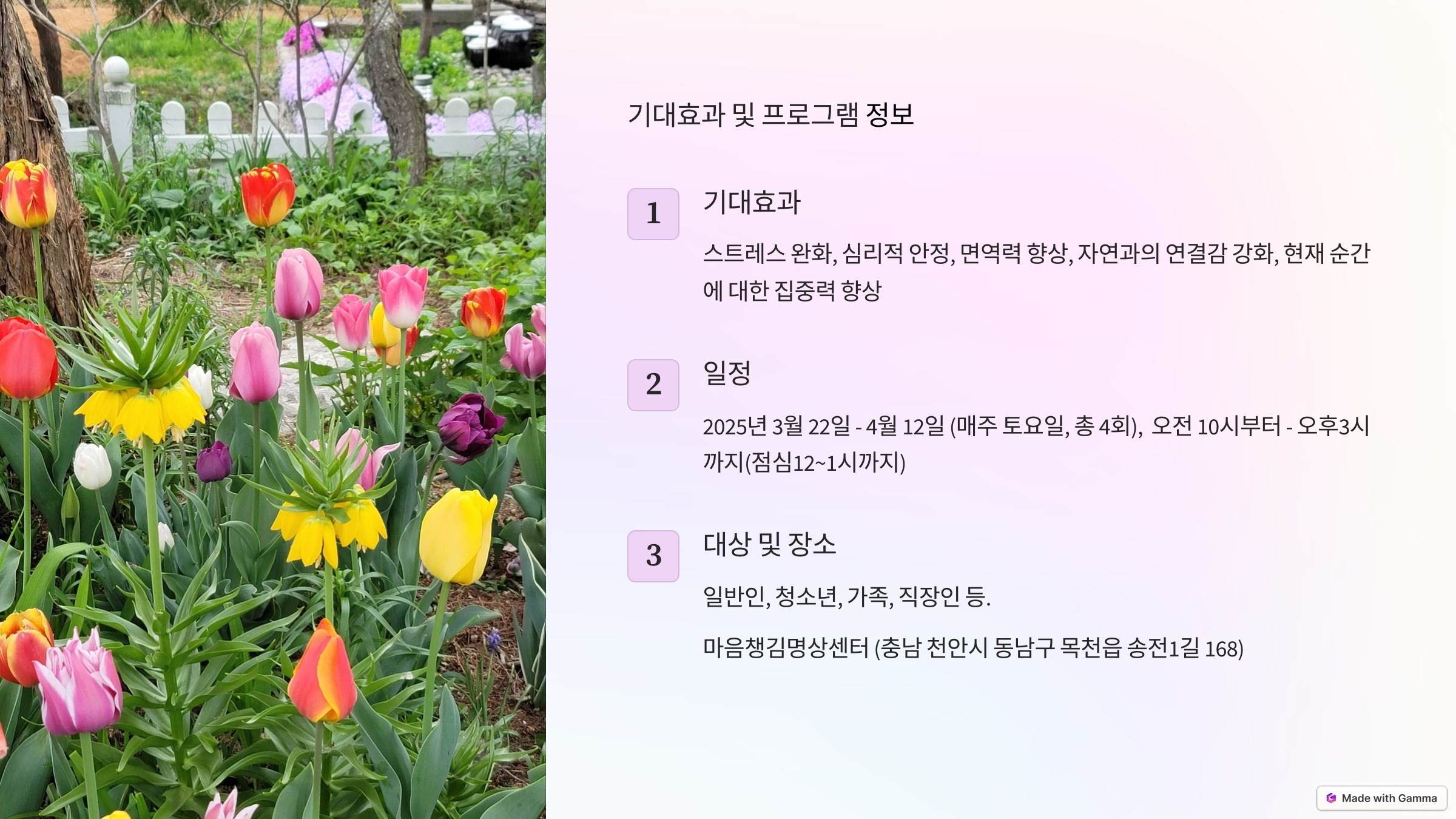 자연과 함께하는 마음챙김 명상 4주간의 치유 프로그램 (시간 수정) 안내 작성자202|작성시간25.02.06|조회수1,009 목록 댓글 0 글자크기 작게가 글자크기 크게가 자연과 함께하는 | Gamma 다음검색 현재 게시글 추가 기능 열기 북마크 공유하기 신고 센터로 신고 댓글 댓글 0 댓글쓰기 답글쓰기 댓글 리스트