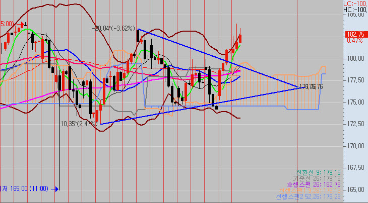 그러나, 하락과 상승의 방향을 잊자. 가는쪽을 추종한다. 그러므로 매도를보되, 182를 돌파한다면 184까지 열리는 장이다. 182.00돌파는 삼각이 상방으로 터지는 신호이니 손절은 절대적. 181.60대 매도후 181.30까지 눌림을 주면서 계속 이익구조로 진을빼다 급등..182돌파..자동손절매.