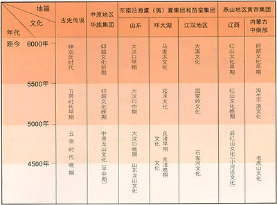 삼황오제 시대 특히 오제시대는 중국, 중화민족 및 다민족통일국가가 형성되는 기초가 된 시기였고 중화민족의 여러 갈래의 선조가 결합되고 다시 구성된 중요한 단계다. 중화 대지상의 다른 경제 유형과 다른 문화 전통이 분포한 제(諸)문화는 특히 앙소문화를 대표로 하고 중원 조 농작 구역을 주요 활동 범위로 하는 신농씨(神農氏) 화족 집단과 어로와 수렵을 주요 경제 활동으로 하는 유웅씨 황제 집단, 그리고 산동성의 대문구 문화와 강소성 쑤쪼우(소주) 태호의 양저문화를 대표로 하고 동남 해안의 벼 농작 구역을 주요 활동 범위로 하는 우하(虞夏)집단이 있다. 이 3대 집단은 각자의 개성을 충분히 발휘한 동시에 문화의 교류와 끊임없는 조합으로 일체가 되어 모이고 문화 공동체의 형성과 발전을 향해 크게 전진했다. 이는 하(夏), 상(商), 주(周) 3대 문명을 위해 견실한 기초를 닦았고 수 천년에 걸친 끊임없는 중화문명 근원의 소재지다.