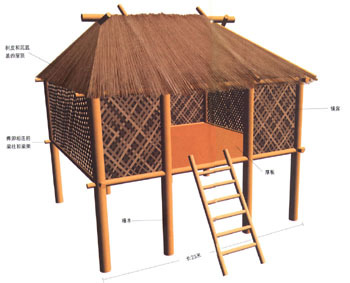 *양자강 하류 상해 항주 소흥 부근의 동이족 유적지인 하모도 유적지의 간란식 방옥 구조도. 중국 고고학계에서는 중국에서 가장 이른 목구조 목구조 건축물이라 자랑한다. 양자강 하류는 하천이 그물처럼 얽힌 습한 지대로 아래는 돼지 등 가축을 기르고 사람은 위에서 생활했다.
