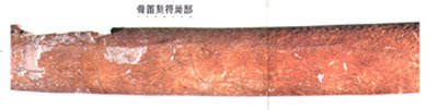 -한글의 원형으로 보이는 문자가 규칙적으로 중앙에 불로 지진 모양으로 표시되어 있다. 이 견갑골은 상(商:殷)나라 때의 것으로 표기되어 있으며, 눈에는 잘 보이지 않으나 사진 오른쪽에 갑골문으로 해석을 달았는데, '상대(商代)의 왕족이 돼지, 개등을 조상에게 바치고 제사지냈다'는 내용이 새겨져있다. 상의 전조(前朝) 하(夏)나라가 멸망할 때, 상나라 성탕을 도와준 상나라의 재상 이윤(伊尹)은 왕조가 다 할 때까지 최고의 권력자로서 제사를 주관했다.