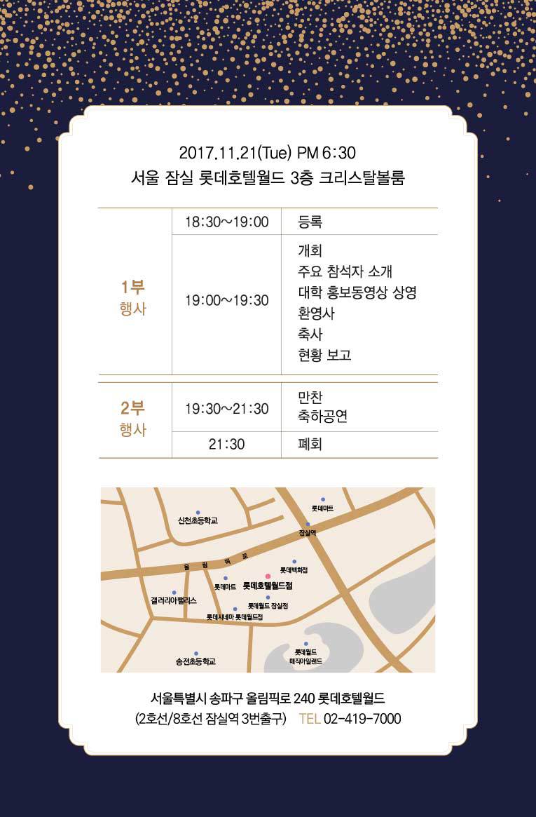 서울 잠실 롯데호텔월드 3층 크리스탈 볼룸에서 2017년 11월 21일(화)pm6:30 개최됩니다.