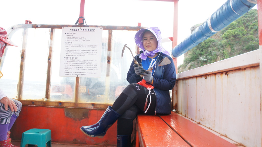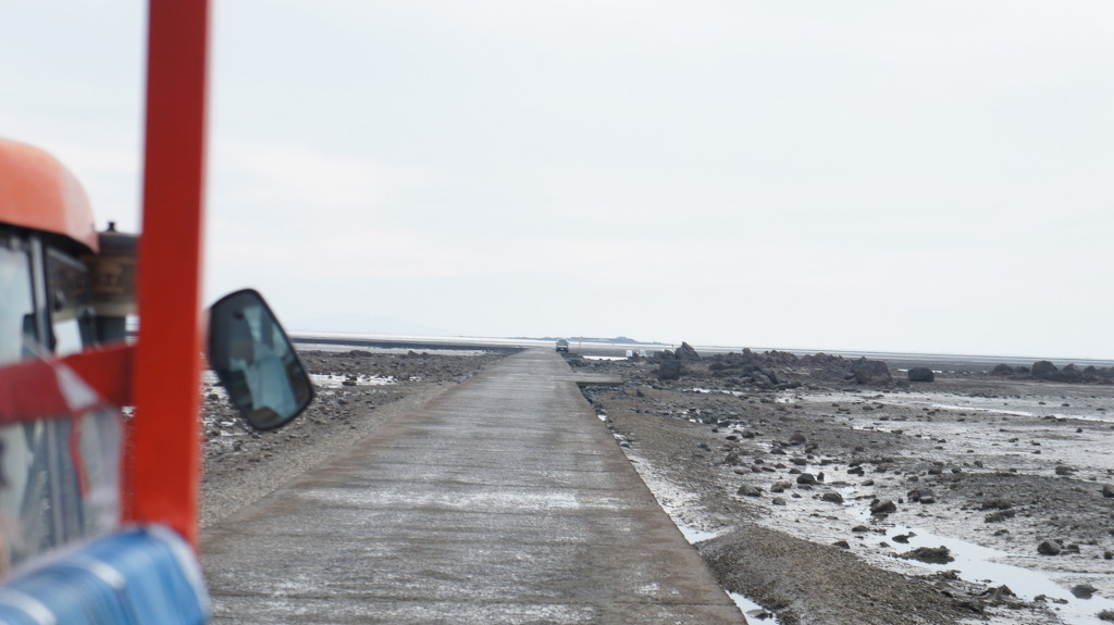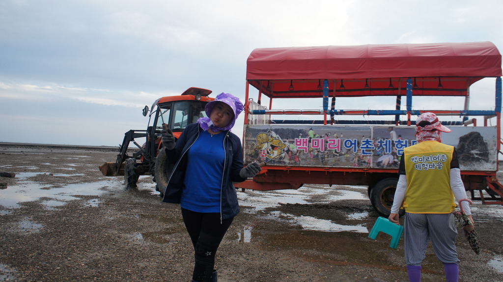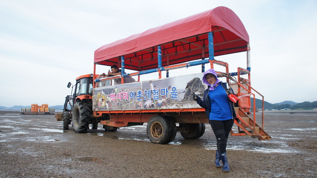 트랙터가 끄는 이동용 차량을 타고 조개잡이에 나선다.