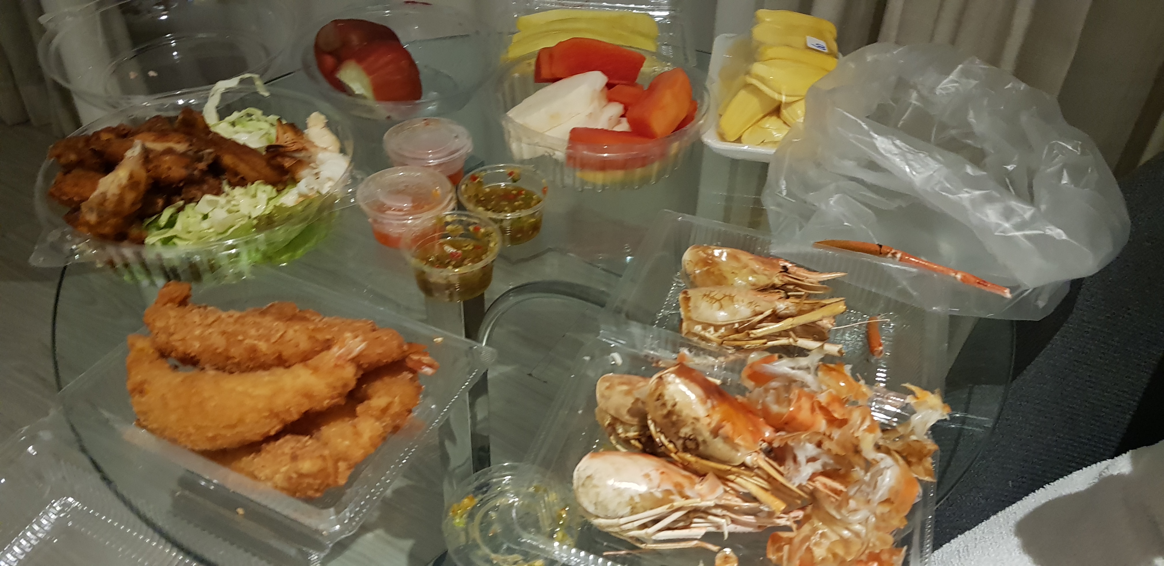 어제 갔던 야시장에 들러 큰 민물 새우찜 5개(400바트)와 새우튀김 5개(200바트)인데 깍아서 550바트, 닭 날개튀김 8조각 200바트, 빅 프릇 과일 15조각 50바트, 비싸서 먹기를 미뤘던 한조각 220바트를 깍아서 200바트.. 딱 1천바트 4만원 저녁을 준비해 호텔로 복귀해 맛있게 먹었네요.