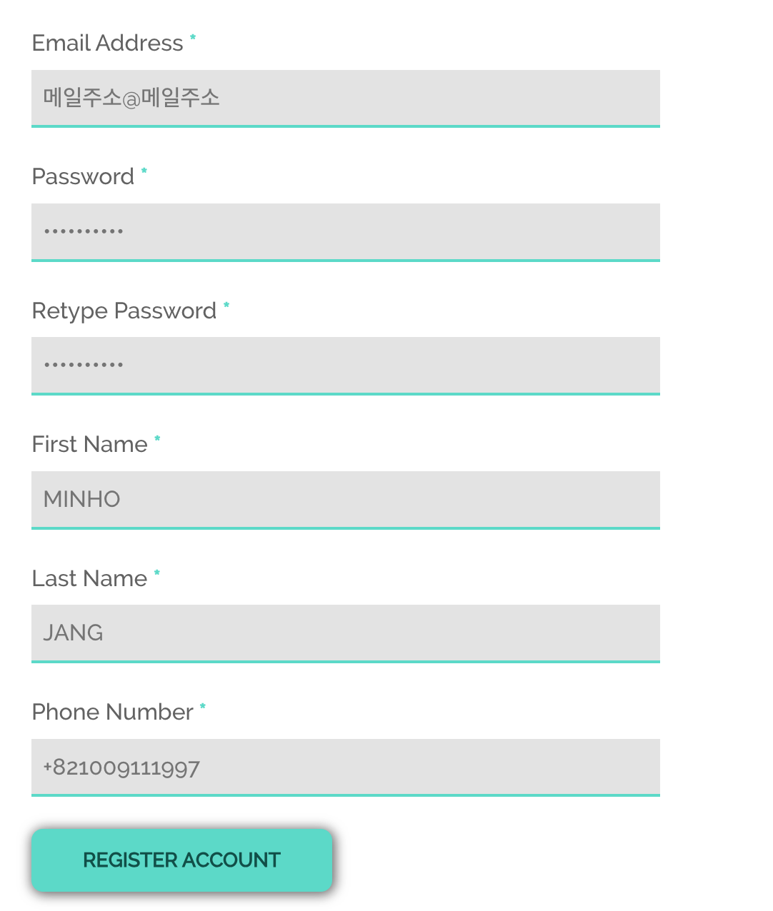 4. 빈칸에 정보 기입 후 가입 완료 (전화번호 입력시 010 대신 8210으로 작성) 합니다.