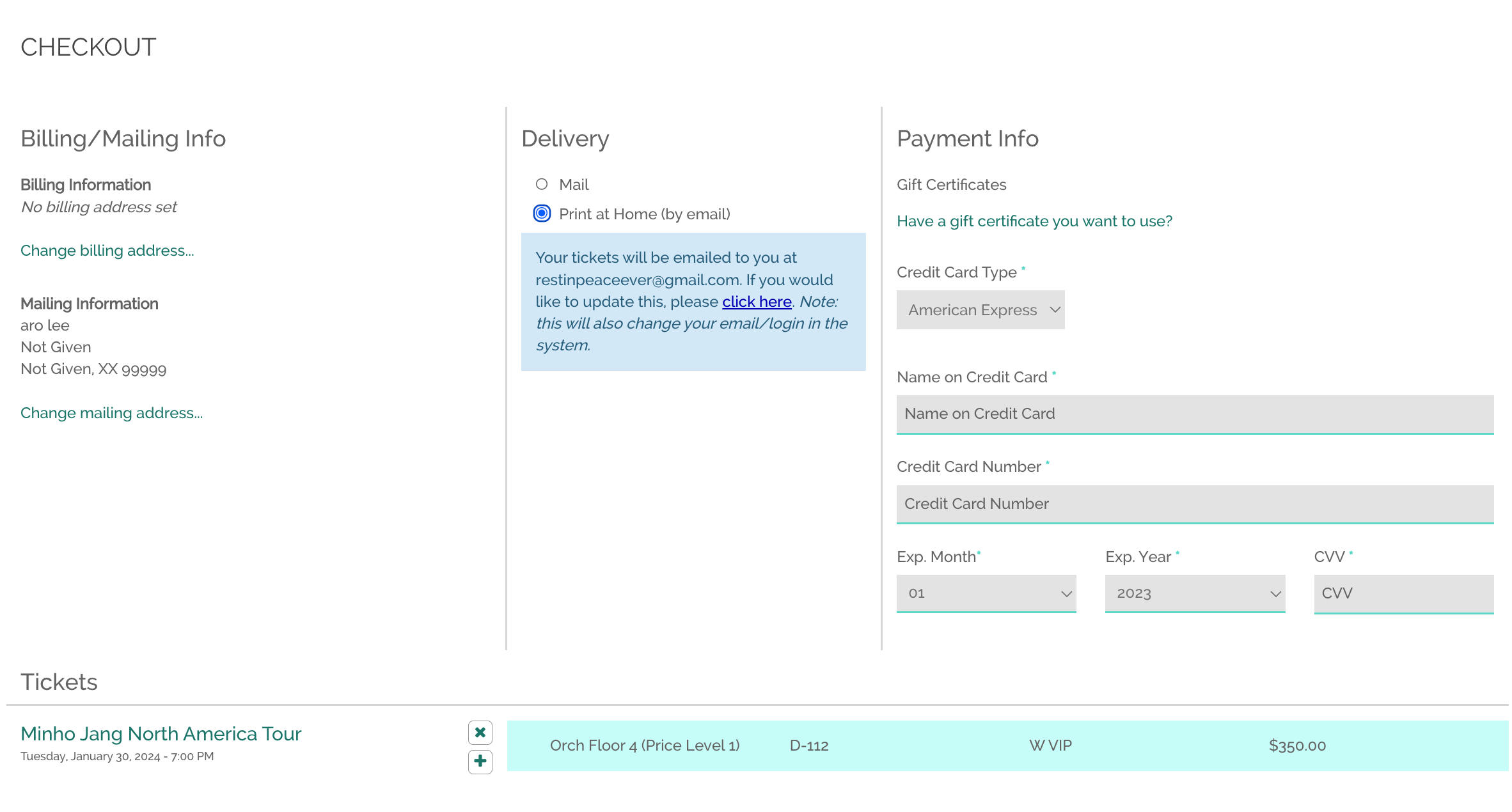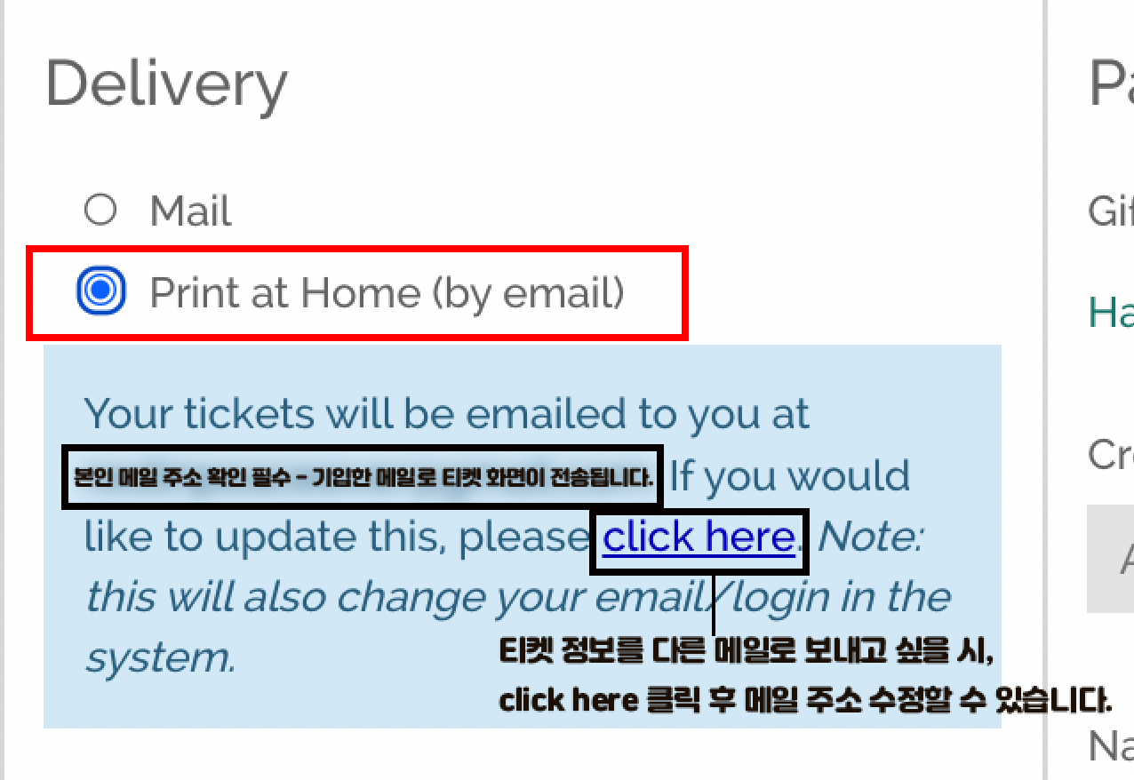 12. 결제 전 Delivery 항목 확인 (티켓 정보는 이메일로 받으시길 권장합니다. 기입된 본인 메일 주소가 정확한지 확인, 수정을 원하시면 Click here 을 눌러 메일 주소를 변경합니다.