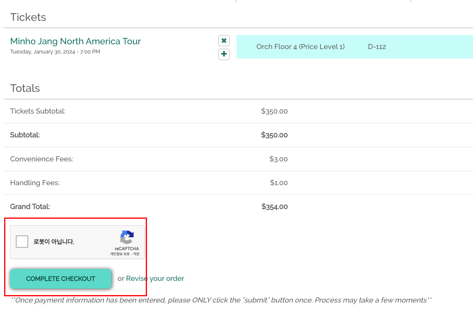 14. 결제 정보에서 하단 스크롤 하면 위의 화면이 뜹니다. 빨간 테두리 안의 로봇이 아닙니다 체크 후 [COMPLETE CHECKOUT] 클릭 시 결제 완료