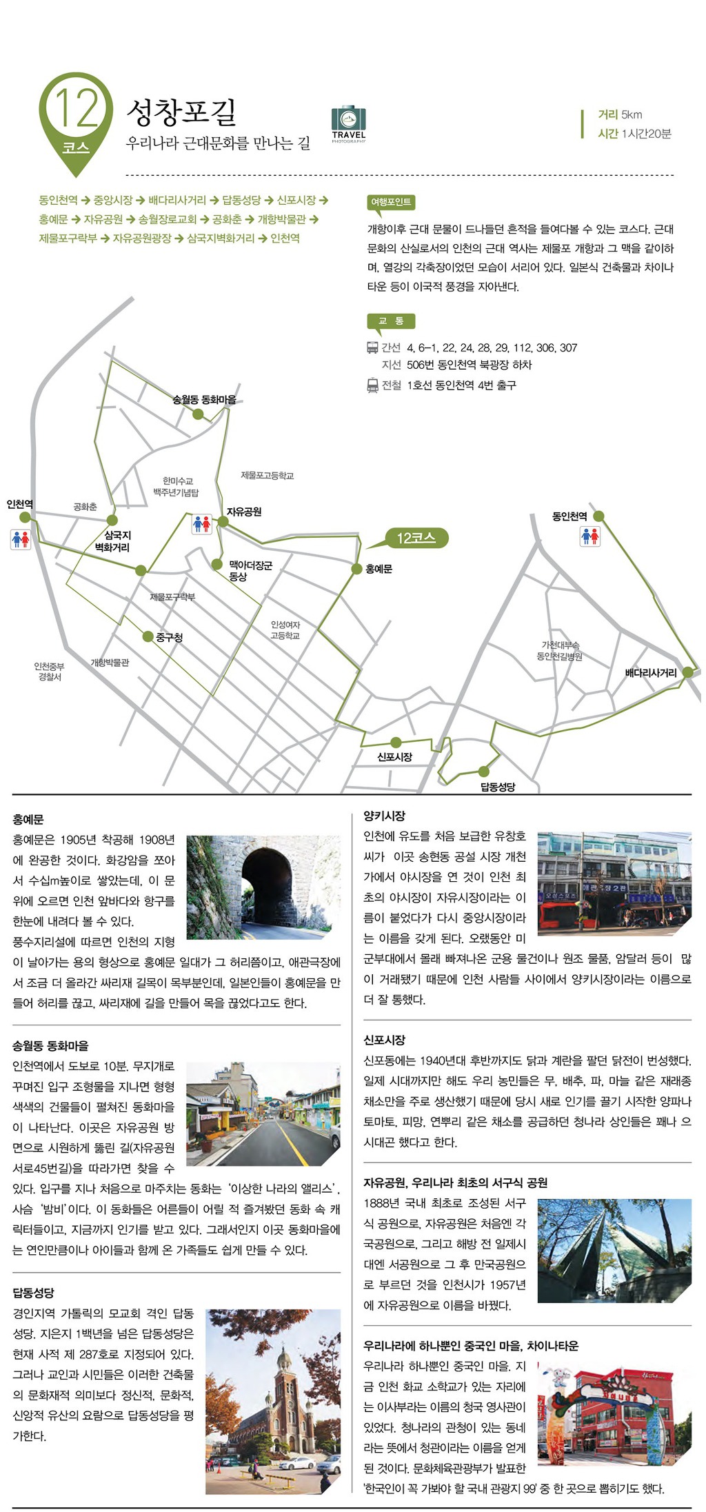 12코스(성창포길) 05.0km/01:20 : 동인천역→중앙시장→배다리사거리→답동성당→신포시장→홍예문→자유공원→송원장로교회→공화춘→개항박물관→제물포구락부→자유공원광장→삼국지벽화거리→인천역
