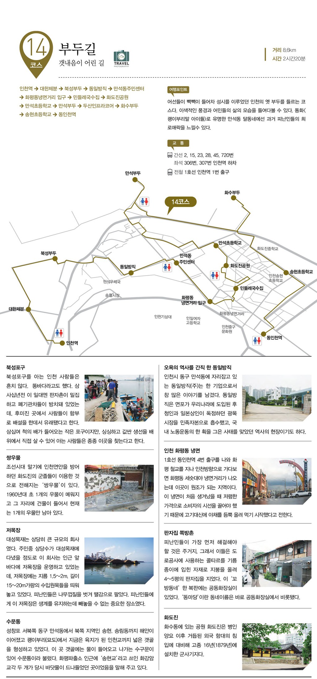 14코스(부두길) 08.6km/02:20 : 인천역→대한제분→북성두부→동일방직→만석동주민센터→화평동냉면거리입구→민들레국수집→화도진공원→만석初校→만석부두→두산인프라코어→화수부두→송현初校→동인천역