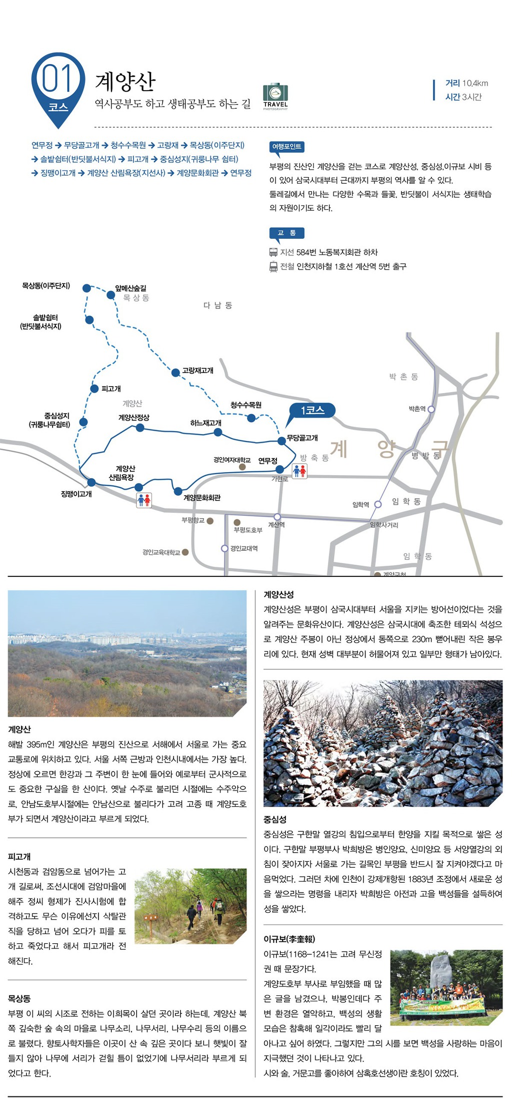 01코스(계양산) 10.4km/03:00 : 계산역⑤→연무정→무당골→청수수목원→목상동→솔밭쉼터→피고개→중심성지→징맹이고개→지선사→계산역