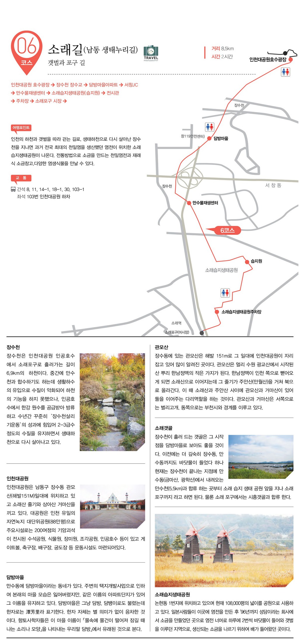 06코스(소래길) 08.5km/02:00 : 인천대공원 호수광장→장수천(장수교→담방마을아파트→서창IC→만수물재생센터)→소래습지생태공원(습지원→전시관→주차장)→소래포구 시장