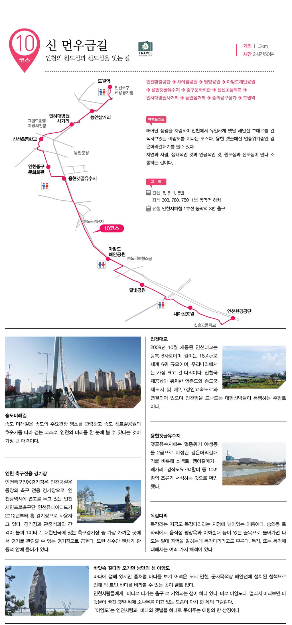 10코스(신 먼우금길) 11.3km/02:50 : 인천환경공단→새아침공원→달빛공원→아암도해안공원→용현갯골유수지→중구문화회관→신선初校→인하대병원사거리→능안삼거리→숭의공구상가→도원역