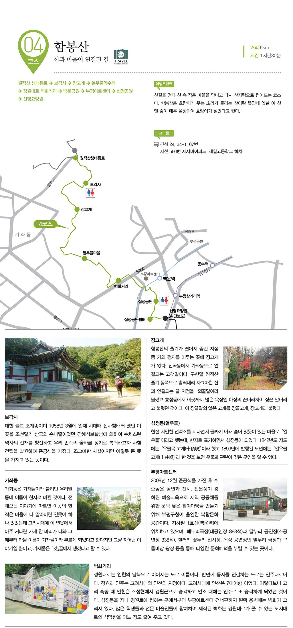 04코스(함봉산) 06.0km/01:30 : 원적산생태통로→보각사→장고개→열우물약수터→경원대로벽화거리→백운공원→부평아트→십정공원→신명요양원