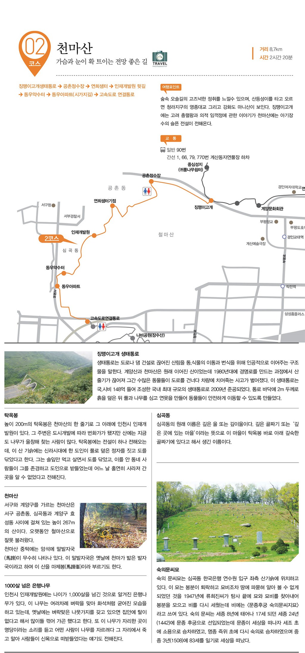 02코스(천마산) 08.7km/02:20 : 징맹이고개→공촌청수장→연희샘터→인재개발원뒷길→동우약수터→동우아파트/시가지길→고속도로 연결통로