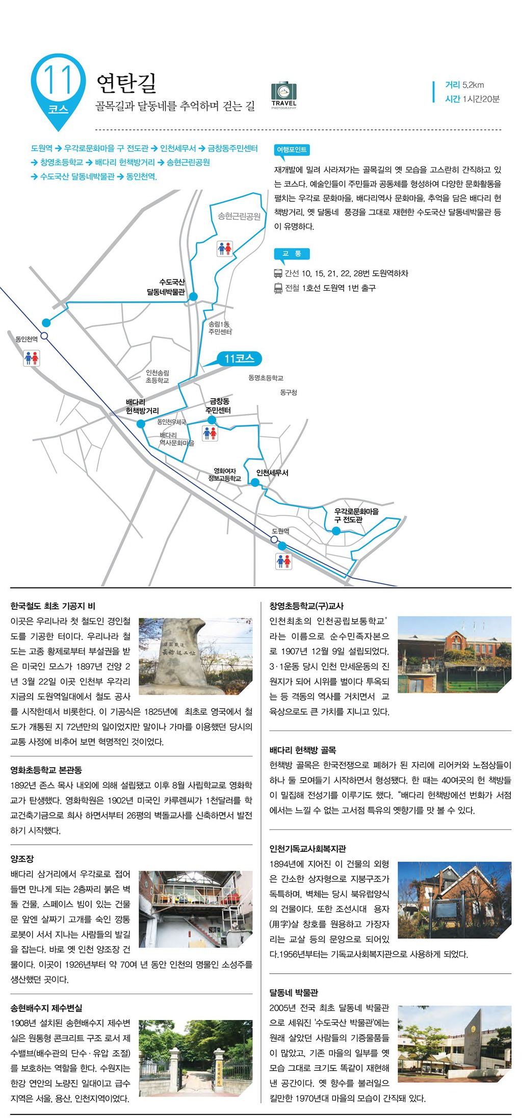 11코스(연탄길) 05.2km/01:20 : 도원역→우각로문화마을 옛→인천세무서→금창동주민센터→창영初校→배다리 헌책방거리→송현근리공원→수도국산 달동네박물관→동인천역