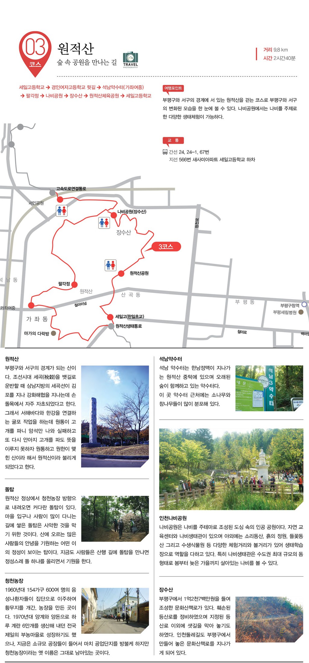 03코스(원적산) 09.8km/02:40 : 세일高→경인女高뒷길→석남약수터/가좌女中→팔각정→나비공원→장수산→원적산공원→원적산체육공원→세일高