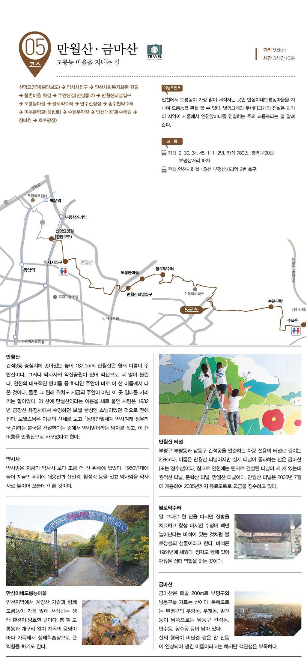 05코스(만월산.금마산) 09.8km/03:10 : 신명요양원(횡단보도)→약사사입구→사회복지회관뒷길→향촌마을뒷길→주안산길(연결통로)→만월산터널입구→도룡뇽마을→불로약수→만수산 정상→송수천약수→미추홀校(성현로)→수현부락길→인천대공원(수목원→장미원→호수광장)
