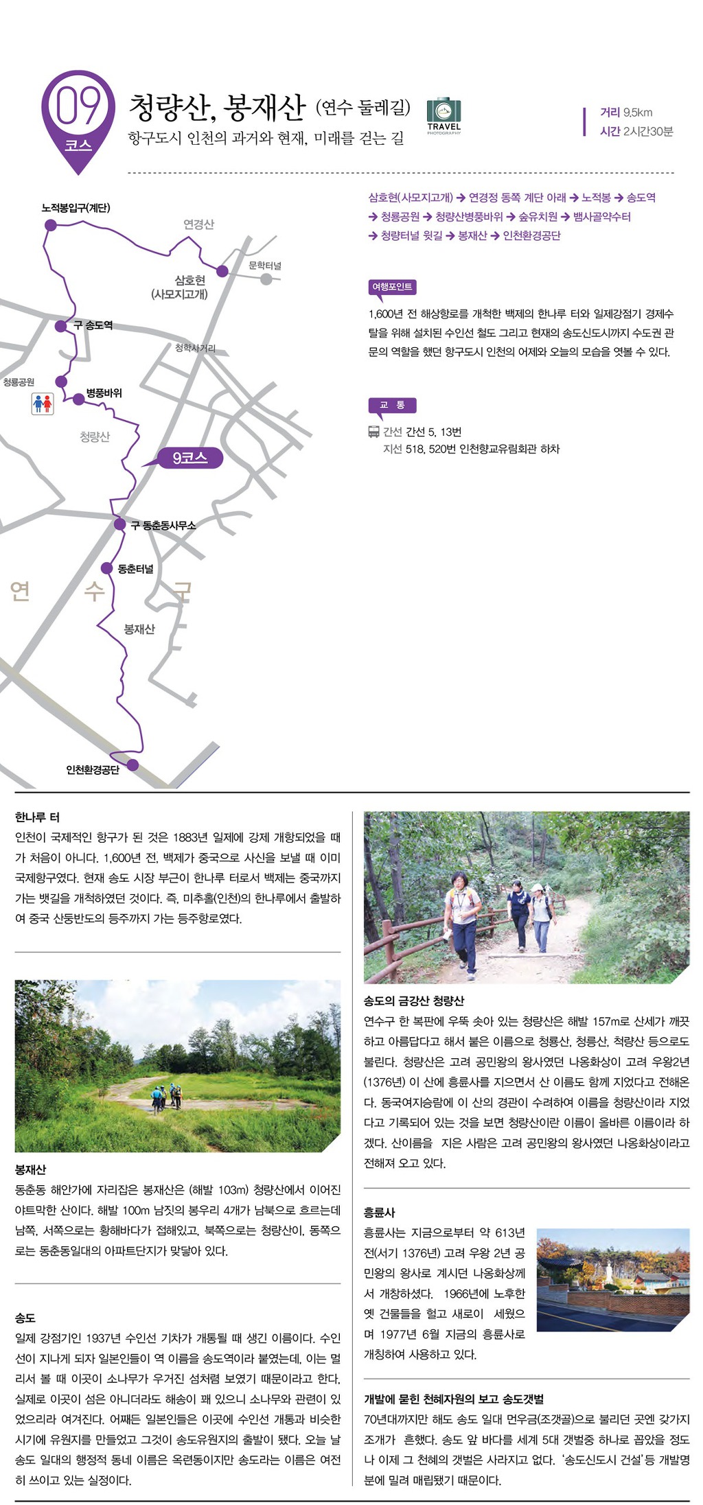09코스(청량산.봉재산) 09.5km/02:30 : 삼호현(사모지고개)→연경동쪽 계단 아래→노적봉→송도역→청룡공원→청량산 병풍바위→숲유치원→뱀사골약수→청량터널 윗길→봉재산→인천환경공단
