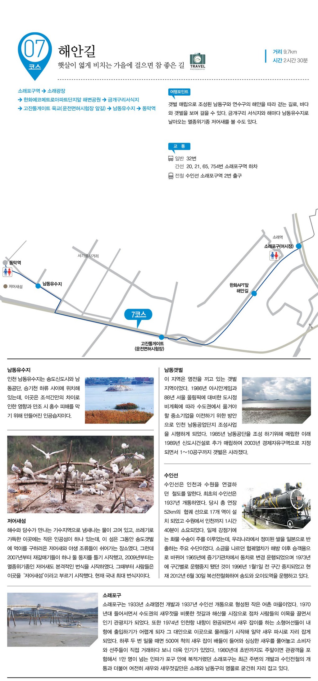 07코스(해안산) 09.7km/02:30 : 소래포구역→소래광장→환화에코메트로아파트앞 해변공원→유수지(한화교→금개구리서식지)→고잔톨게이트 육교(운전면허시험장 앞길)→남동유수지→동막역
