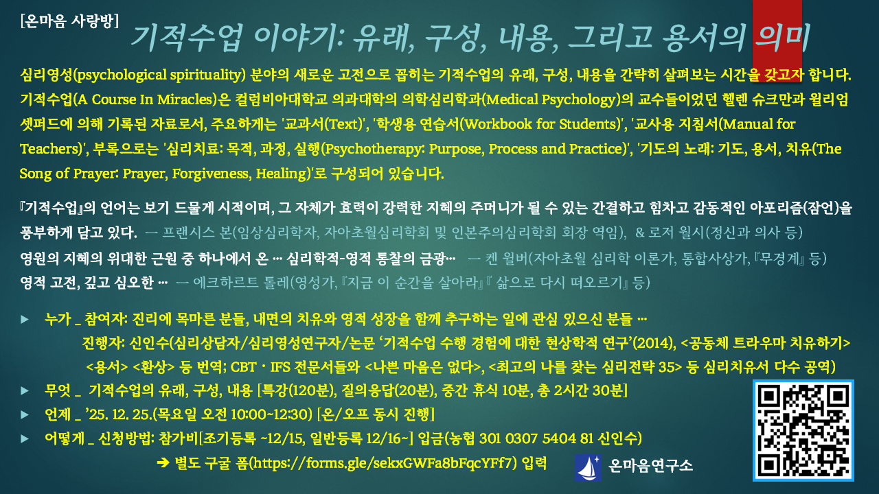 심리영성(psychological spirituality) 분야의 새로운 고전으로 꼽히는 기적수업의 유래, 구성, 내용을 간략히 살펴보는 시간을 갖고자 합니다.