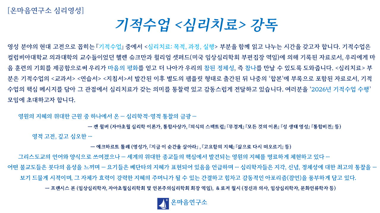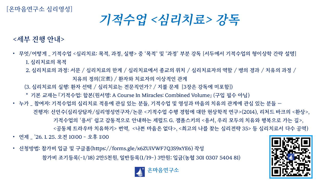 <심리치료> 부분은 기적수업의 <교과서> <연습서> <지침서>서 발간된 이후 별도의 팸플릿 형태로 출간된 뒤 나중의 ‘합본’에 부록으로 포함된 자료로서, 기적수업의 핵심 메시지를 담아 그 관점에서 심리치료가 갖는 의미를 통찰력 있고 감동스럽게 전달하고 있습니다. 여러분을 ‘2026년 기적수업 수행’ 모임에 초대하고자 합니다.