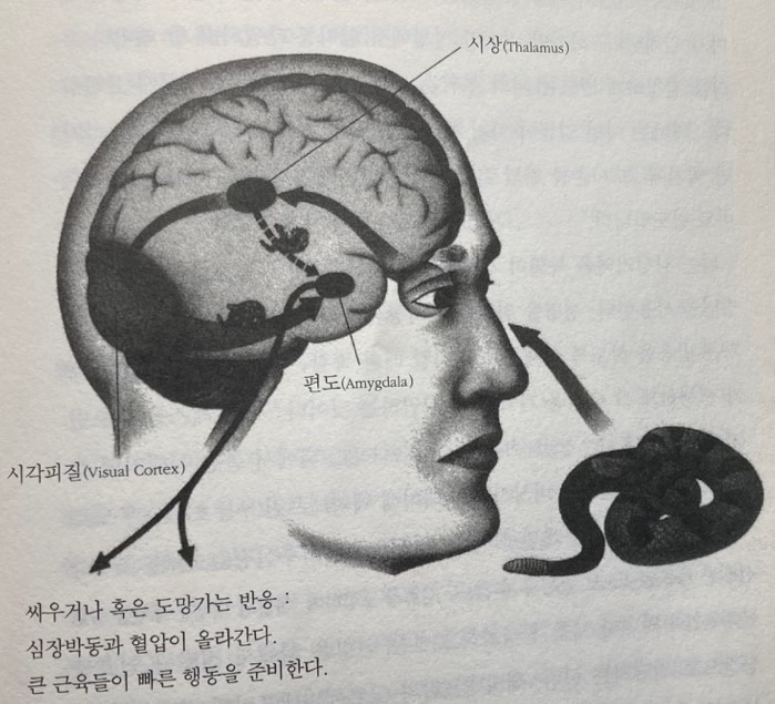 두뇌의 구조에서 편도는 사회적 보안회사 같은 존재다. ~~~이를테면 두려움의 경보가 울릴 때 편도는 긴급 신호를 두뇌의 모든 주요한 부위로 보낸다. 편도는 인체가 싸울 것인지 도망갈 것인지를 결정하는 호르몬을 분비시키고, 동작중추에 동원령을 내리며, 심장혈관과 근육, 창자를 활성화 한다.