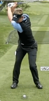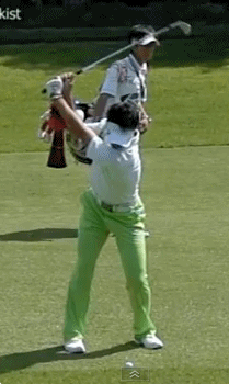 다운스윙에서 오른 팔은 다운되면서 상체의 리드로 돌아가야 하는데 팔이 먼저 다운되고 있다. 이러면 닭날개가 된다. 오른 팔에 힘이 많아도 팔이 몸보다 앞서서 나간다.