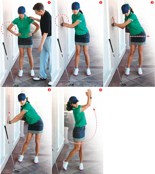 다운 스윙 때에 왼 허리가 뒤로 빠지거나 돌지 않게 하려면 어드레스 모양을 유지한 채 클럽이 빠져 나간 후에 거의 동시 동작으로 채를 뒤따라 오른 허리를 접은채 밀어주며 돌면 된다. 이것은 일반 샷이나 숏게임에서나 똑 같다.