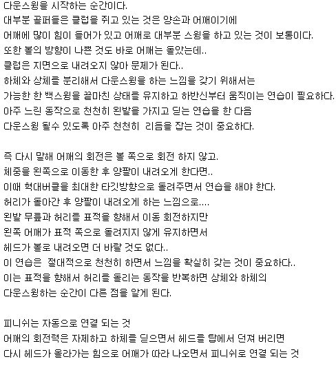 스윙의 원리를 알고 스윙으로 공을 쳐야지, 공을 때리거나 맞히는 다운 스윙은 몸을 망친다. 피니시를 끝까지 하자.