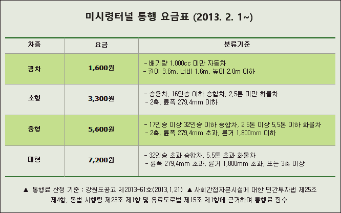 설악권 영업용 차량(개인, 법인) 미시령터널 감면 적용 (시행: 2014년 4월~)