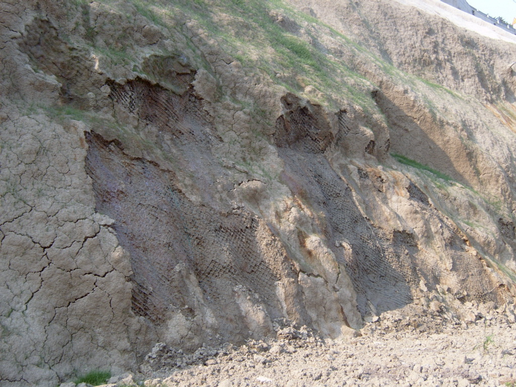 ▲ ▼ 절개된 법면에 부착한 녹화용 식생토와 암벽 부스러기가 봄철 해빙기와 장마철 호우시에 탈락하여 무너져 내린 모습.