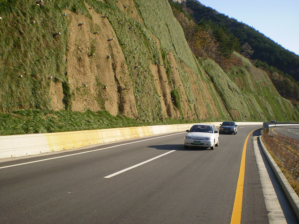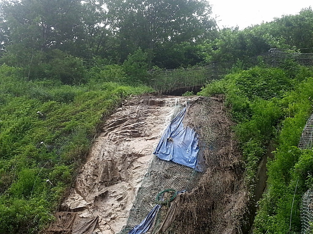 도로 옆 절개지를 녹화한다며 심은 풀과 흙이 유실되면서 암반이 드러났습니다. 암반을 덮고 있던 천막과 철망은 찢어진 채 어지럽게 방치돼 있습니다. 5km에 달하는 도로 구간에서 이렇게 풀과 토사가 쓸려나간 절개지는 수십 군데에 이릅니다. 특히 비가 많이 오는 요즘 같은 장마철에 이런 현상은 더욱 심해집니다. 절개지 암반에 천막을 깔고 그 위에 풀씨와 흙을 뿌렸는데, 풀이 제대로 활착하지 못한 겁니다.