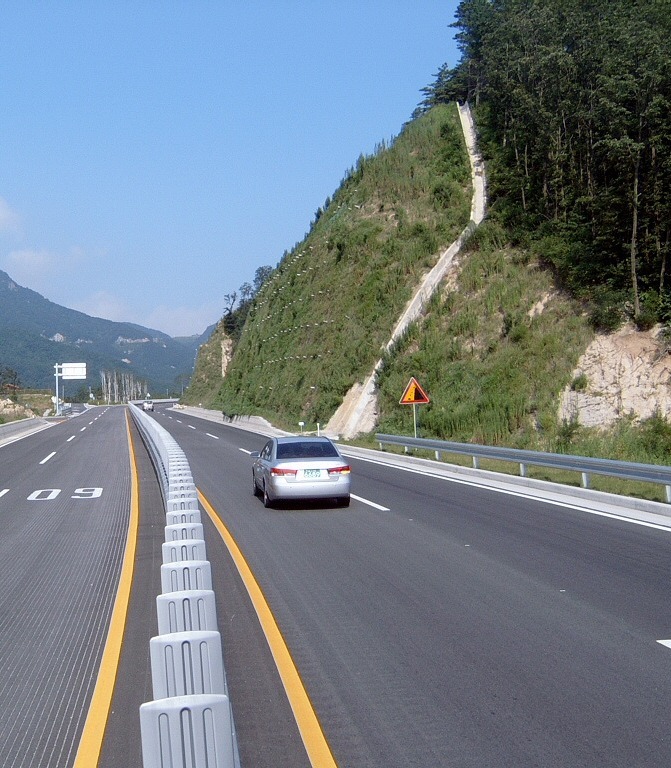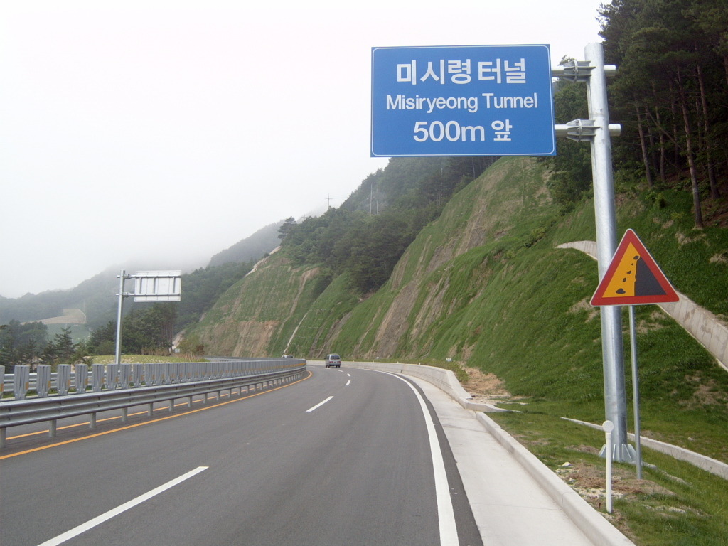 절개면이 많은 미시령관통도로 3공구 상단부 상행선(톨게이트에서 미시령터널 입구까지의 인제방향 오르막길)은 '낙석주의' 구간입니다. 이 구간은 절개된 법면에 부착한 녹화용 식생토와 암벽 부스러기가 봄철 해빙기와 장마철 호우시에 탈락하여 무너져 내리는 일이 종종 발생합니다. 미시령관통도로를 비롯해 절개면이 많은 강원도의 산간도로 주행시 낙석 위험에 특별히 유의하고 긴장하면서 방어운전하시길 바랍니다.