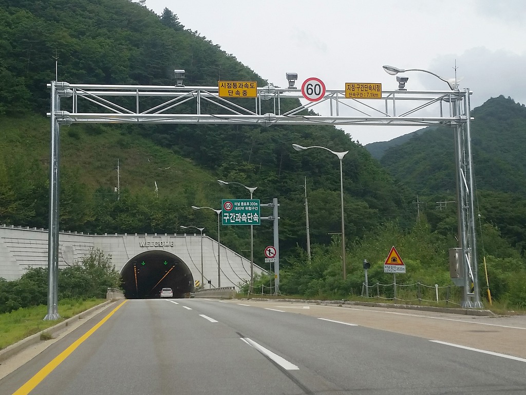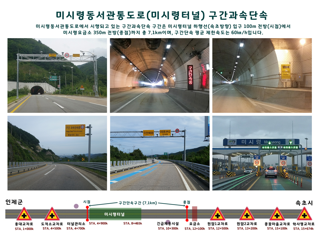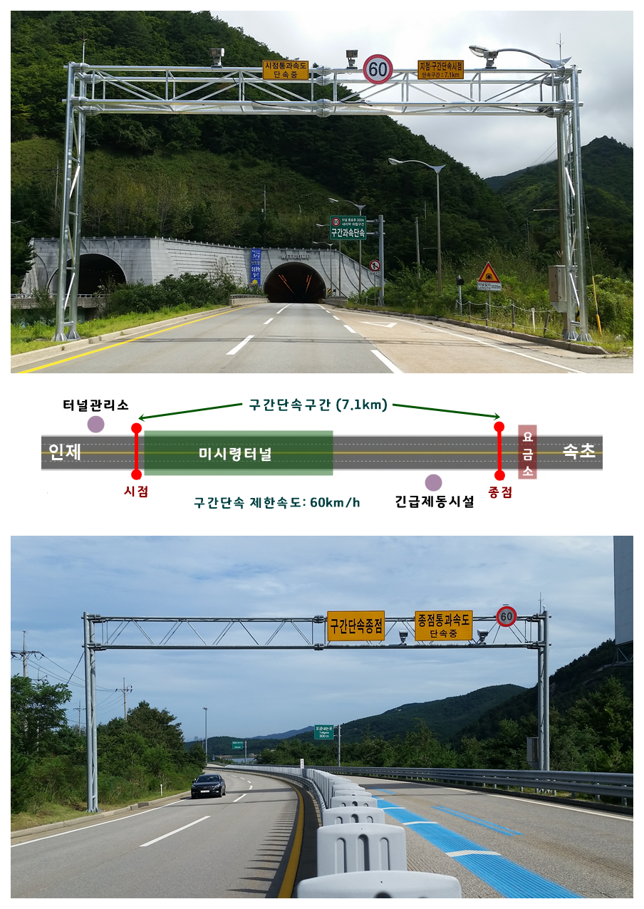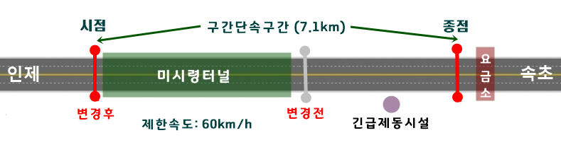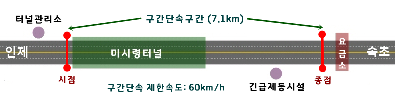 ▲ 미시령터널(하행선: 3,520m)이 구간단속 구간에 포함되면서 구간단속 구간의 길이가 이전의 2.9km에서 7.1km로 늘어났고, 미시령터널 내 제한속도는 이전의 70km/h에서 60km/h로 하향 조정되었습니다.