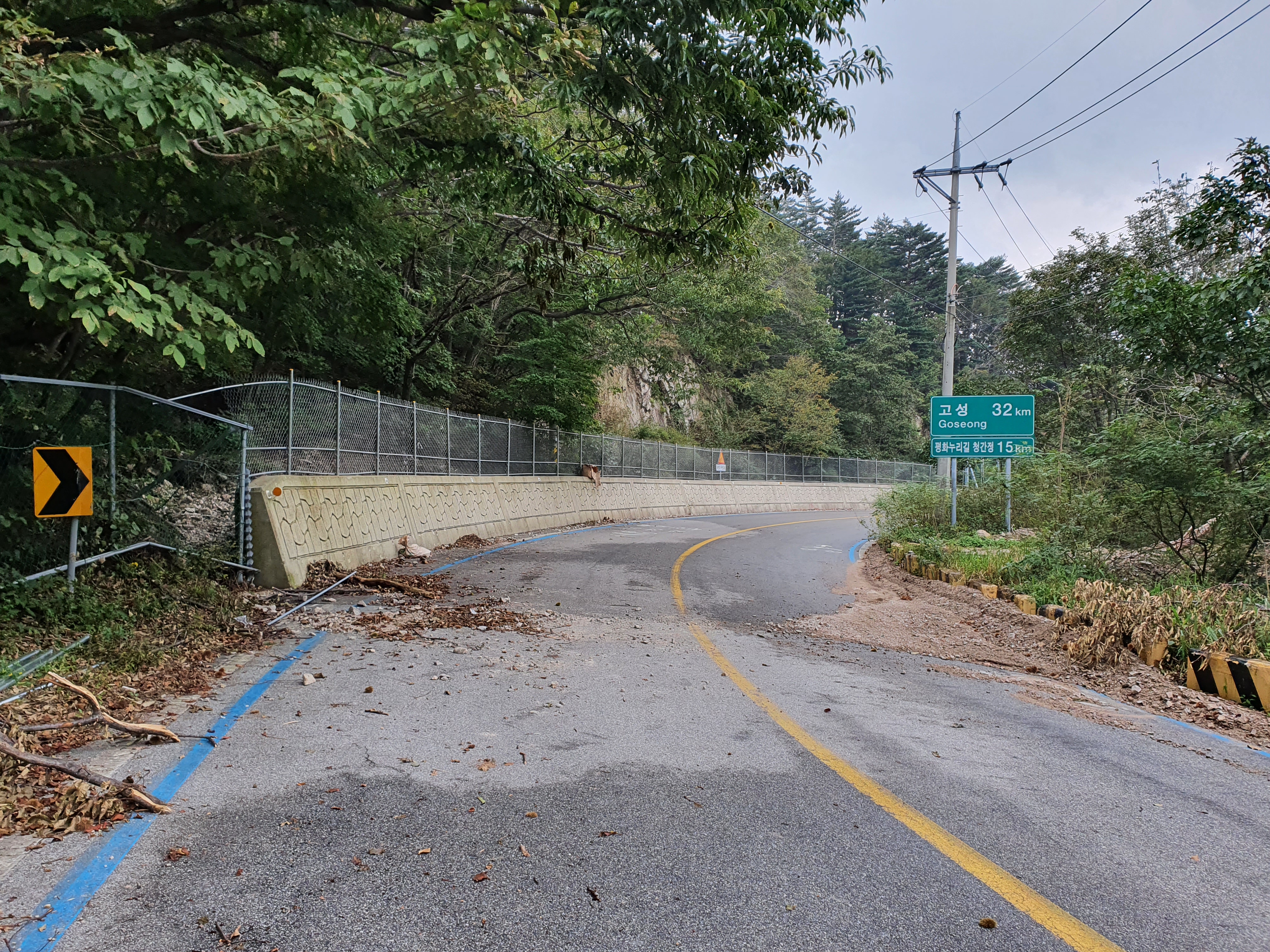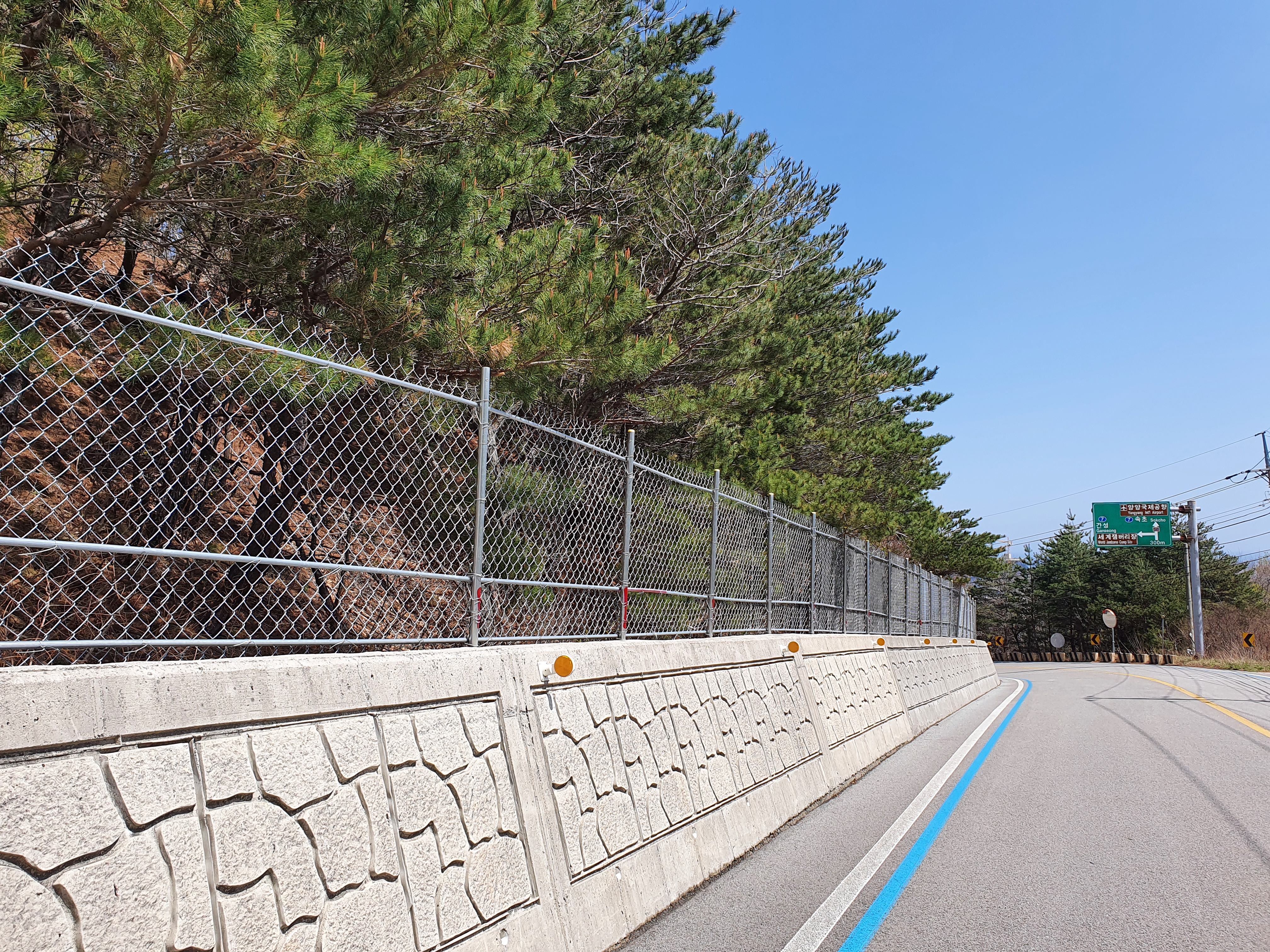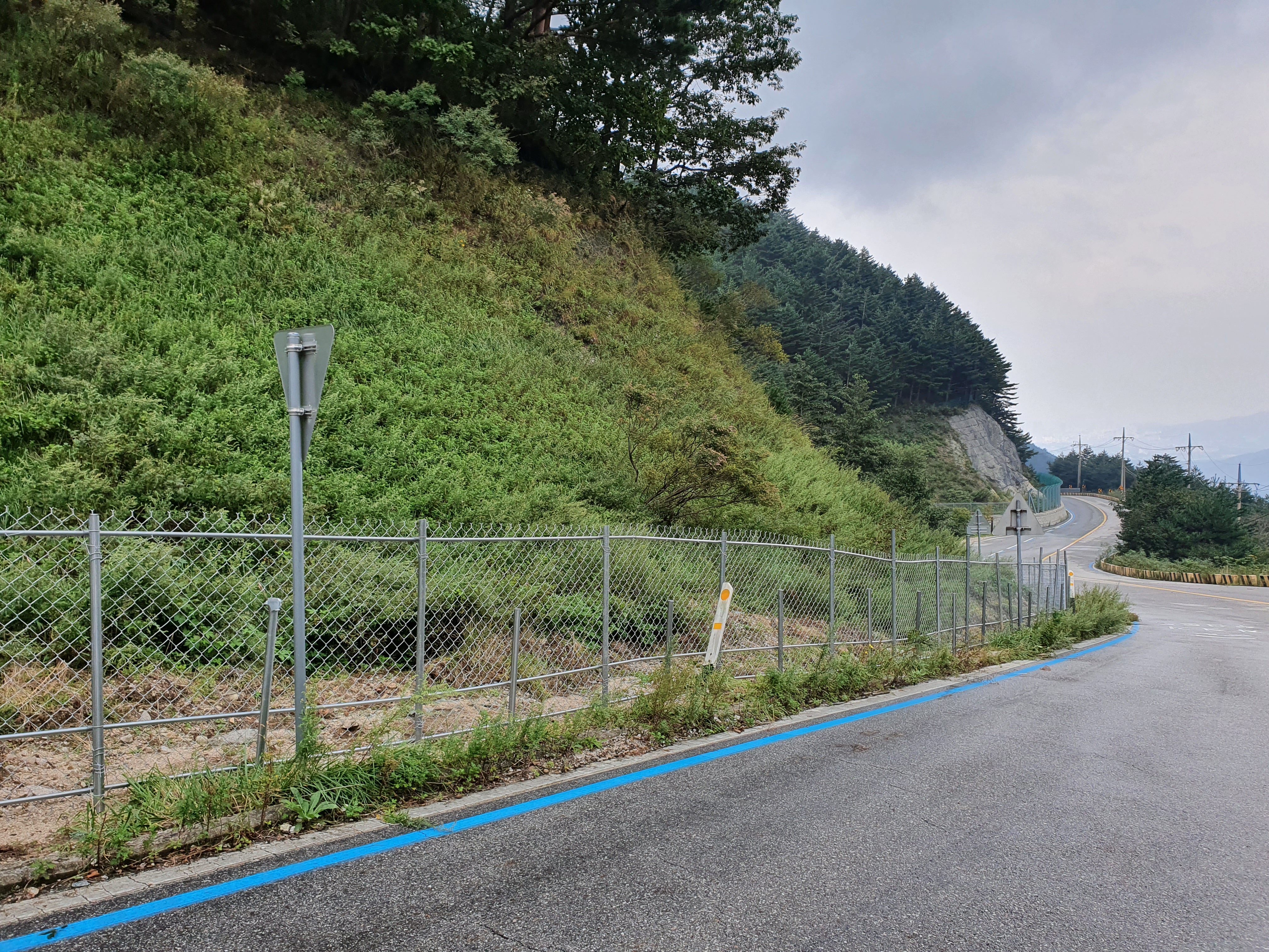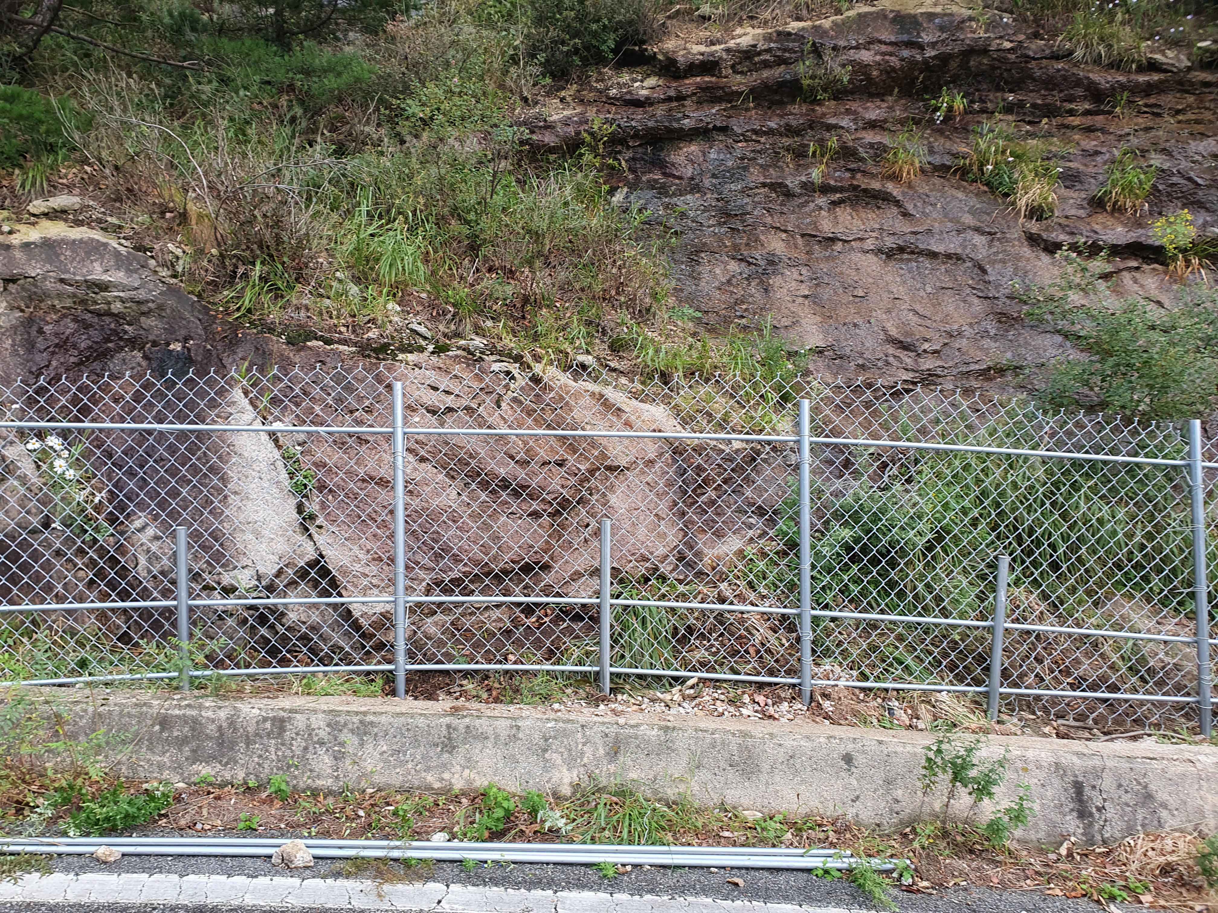 ▲ 환경부가 2020년 하반기, 인제군 용대리와 고성군 원암리을 잇는 미시령옛길 전역에 '아프리카돼지열병'(ASF) 방역과 멧돼지 이동(남하)을 차단하기 위해 설치한 철책. (오른쪽, 2020년 9월 16일 촬영) 기존에 이미 미시령옛길 도로사면에 설치된 콘크리트 옹벽과 낙석방지망, 가드레일 같은 인공구조물에 더해 또 다른 견고한 장애물이 2중, 3중으로 설치됨으로서 산양을 비롯한 여타의 야생동물이 번식, 월동, 휴식 등을 위해 이동하는 것이 불가능해져 이로 인한 백두대간 생태축 단절, 서식지 훼손과 고립 같은 문제가 대두되고 있습니다.