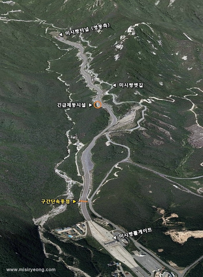 미시령터널 하행선(속초방향) 출구에서 톨게이트로 내려가는 내리막길(약 3.6km)은 급경사와 급커브로 이루어져 있어 운전자들의 브레이크 작동이 빈번해 브레이크 과열이나 파열같은 브레이크 고장 사고가 자주 일어나고, 빗길/눈길 미끄럼 사고도 자주 발생하는 사고위험이 매우 높은 구간입니다. 교통사고 다발지역인 이 구간의 제한속도는 60km/h이며, 사고 예방을 위해 운전자들은 안전벨트를 필히 착용하고 충분한 차간거리를 확보하면서, 반드시 저단기어로 '엔진브레이크'를 사용해 규정속도를 준수하고, 눈, 비, 안개 등 악천후시에는 평소보다 20~50% 감속해 운행하시길 당부드립니다.