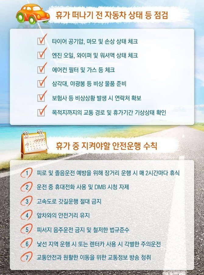 작성자울산바위작성시간22.07.10조회수16,491 목록 댓글 0여름 휴가철이 다가오면서 많은 이들이 무더위를 피해 산과 계곡, 강, 바다로 떠날 계획을 세우고 있습니다. 시원한 자연 속에서 더위를 식히고 일상의 스트레스를 해소하기에 이때만한 기회가 없죠. 하지만 휴가철에는 낯선 초행길을 운전하는 경우가 많고, 들뜬 마음에 긴장이 풀어지기 쉬워 교통사고 위험이 평소보다 높아집니다. 특히, 휴가지로 향하는 도로는 차량이 몰리며 혼잡해지고, 급하게 운전하거나 졸음운전을 하다 보면 자칫 큰 사고로 이어질 수 있습니다.