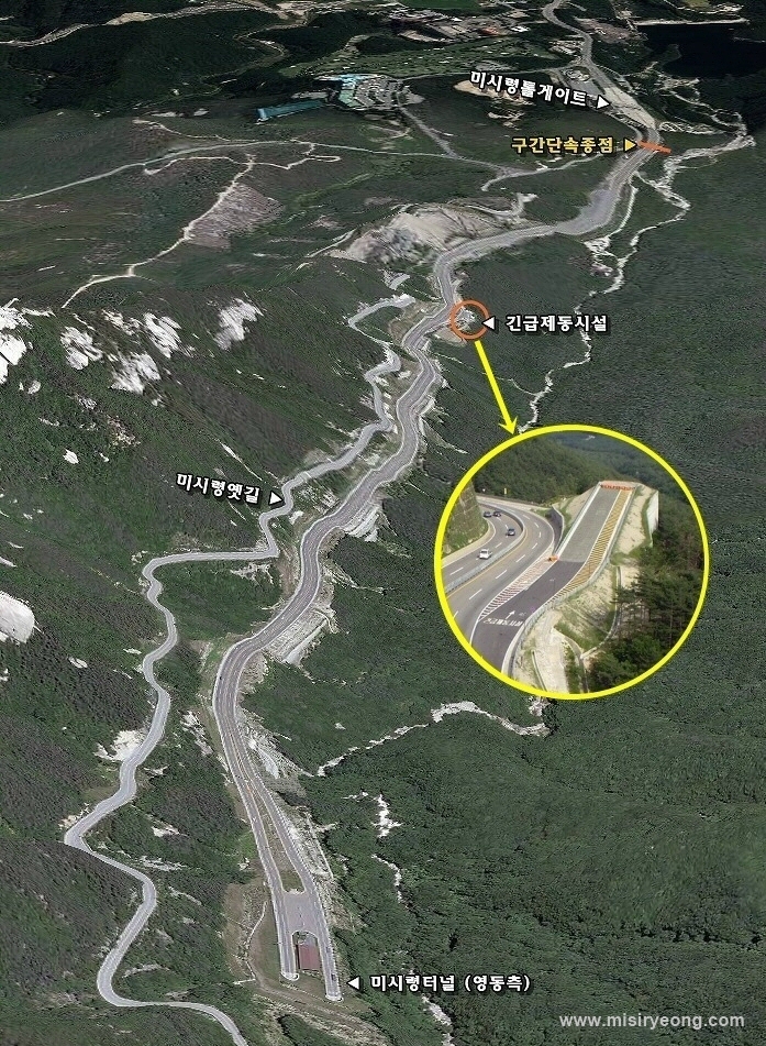 긴급제동시설(Emergency Escape Ramp)은 자동차가 주행 중에 제동장치가 고장날 경우, 자동차의 도로이탈 및 충돌사고를 방지하고 승객 및 차체에 대한 손상을 최소화 하기 위해 급경사의 내리막 길이 연속된 곳에 설치하는 교통안전시설입니다. 긴급제동시설 바닥에는 자갈이 깔려있어 차량 진입시 속도를 감소시켜 제동을 하게 됩니다. 미시령관통도로의 긴급제동시설은 미시령터널 하행선(속초방향) 출구에서 톨게이트로 내려가는 내리막길 중간에 설치되어 있습니다. (미시령터널 출구로부터 약 1.9km | 톨게이트 1.7km 전)